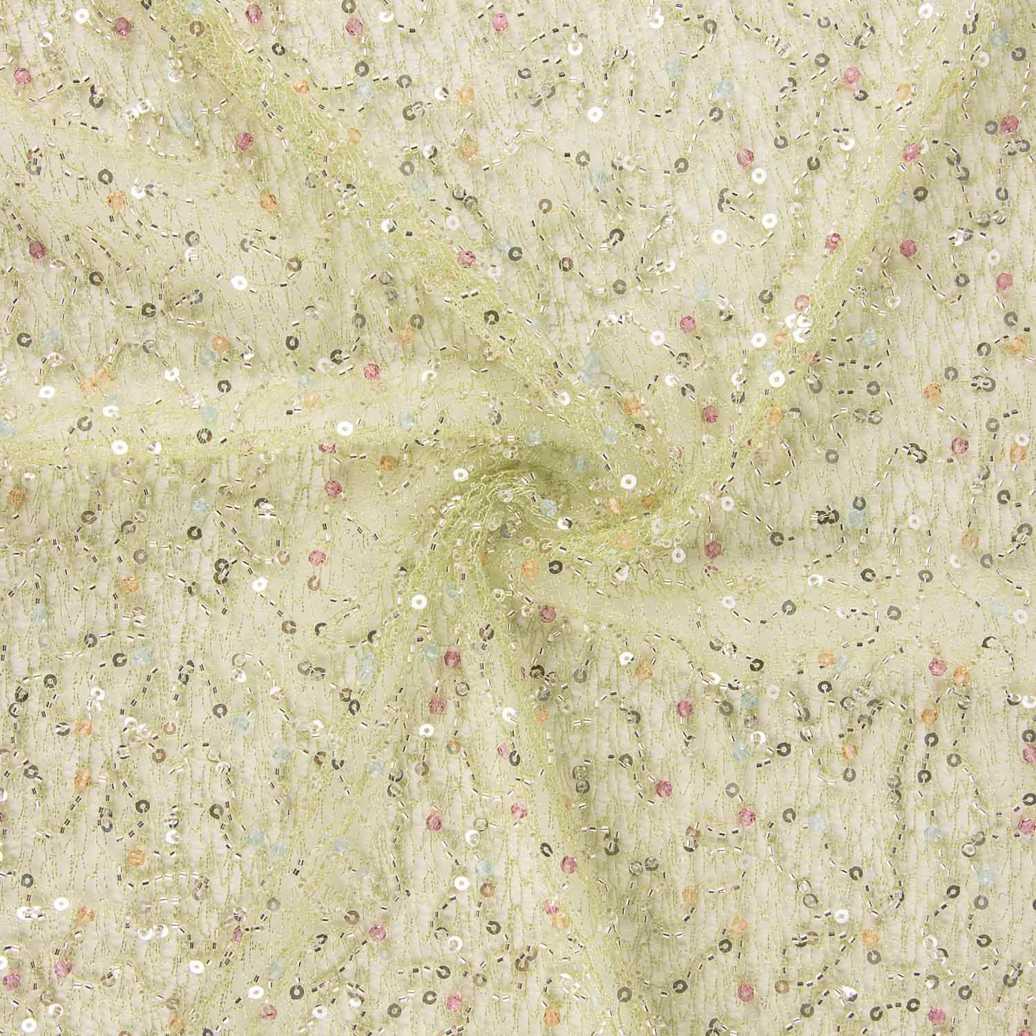 Pausini green weighted tulle fabric with rhinestones. Light pink transparent tulle base embroidered with crystals and sequins in matching shades that add sparkle and shine to your creations. Wavy finish on both selvedges, which you can use as a hem, neckline, waist or sleeve finish. Beaded fabric embroidered on tulle with unembroidered areas creating transparency, which can be covered with matching lining fabrics such as crepe or satin. Take special care when sewing, manually removing the beads and sequins in the seam areas and then reattaching them to cover the spaces for a professional finish.