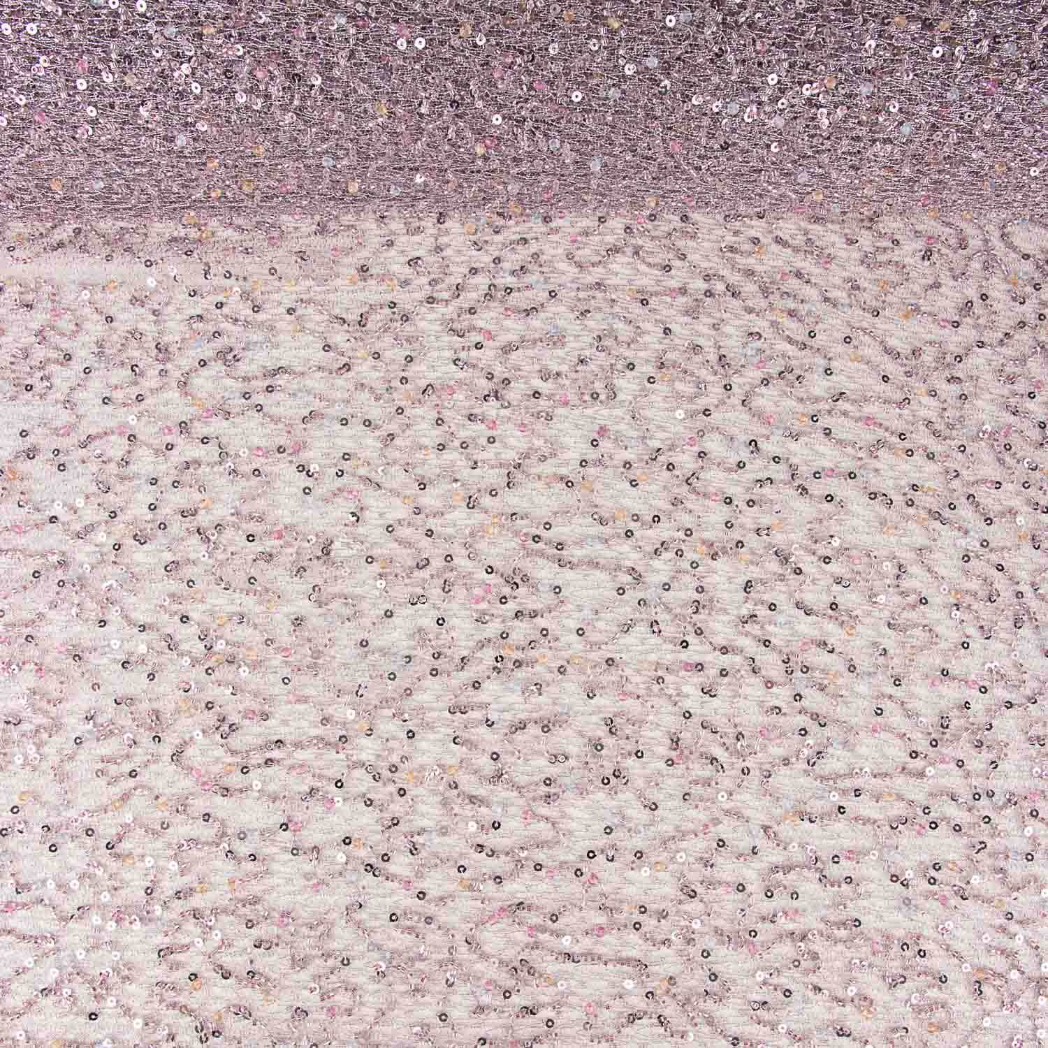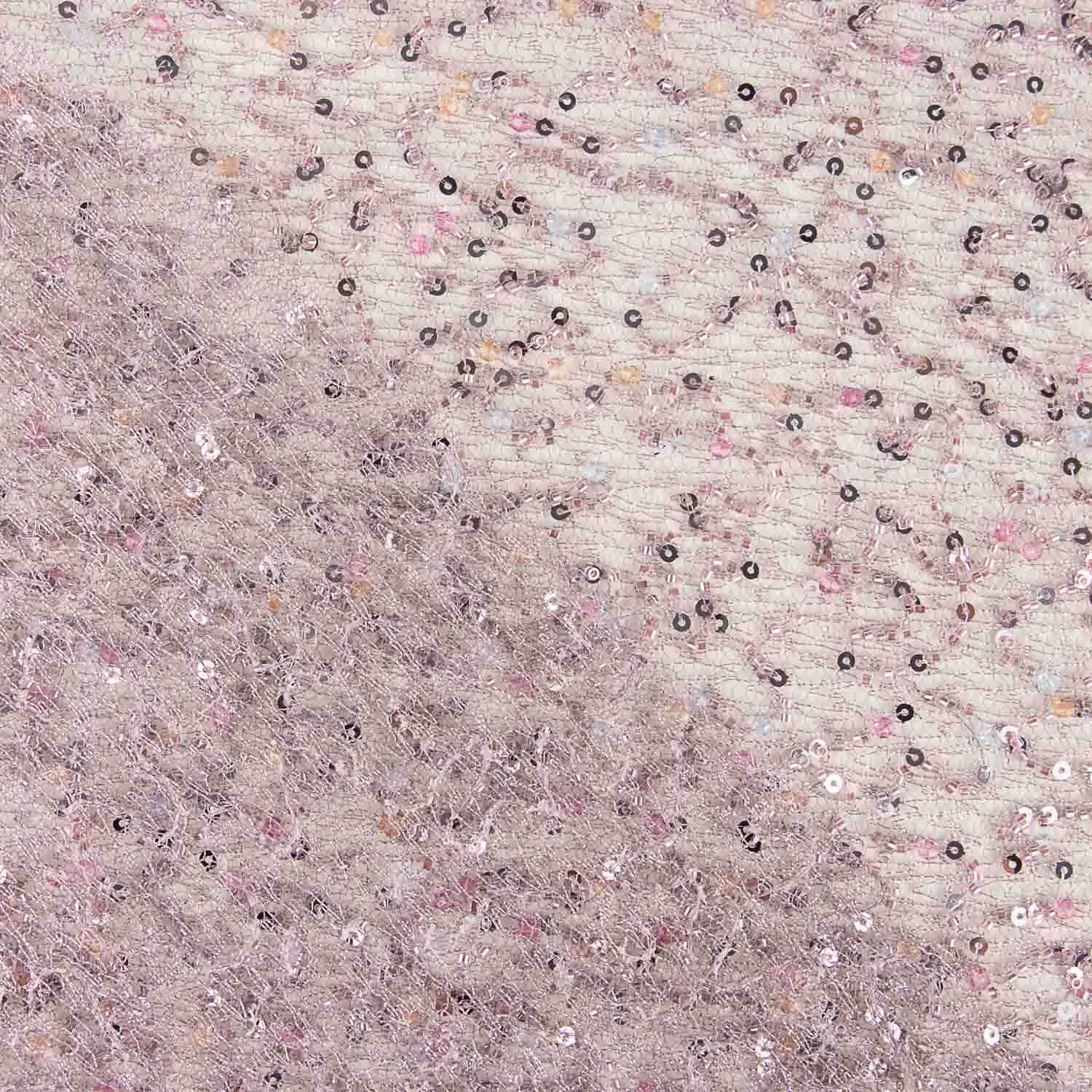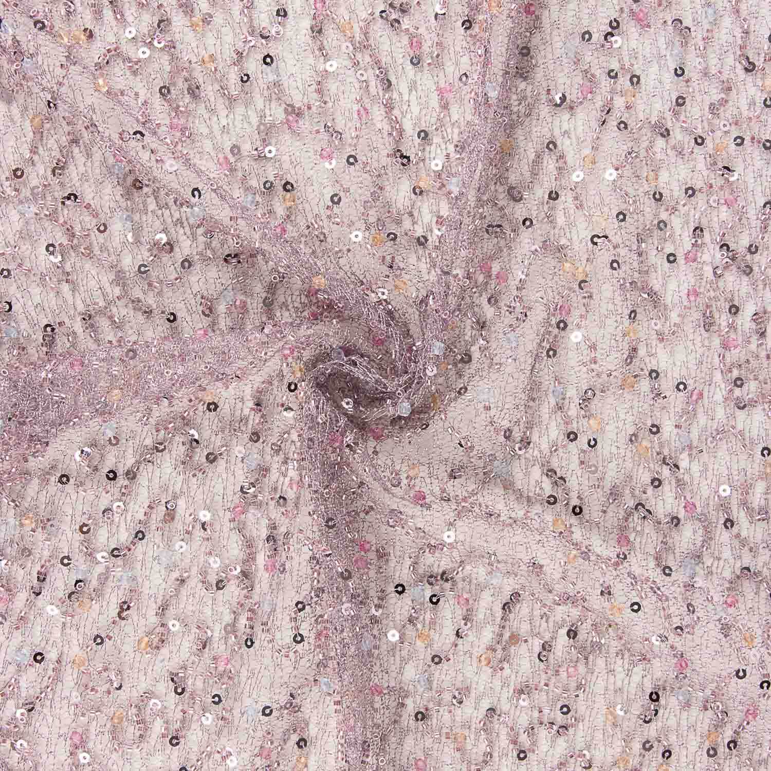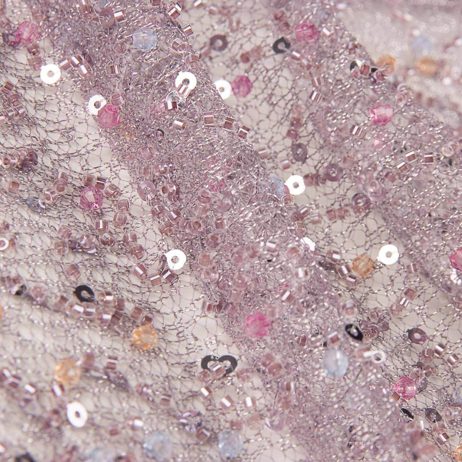 Lavender Pausini beaded tulle fabric with weight. Light pink transparent tulle base embroidered with crystals and sequins in matching shades that add sparkle and shine to your creations. Wavy finish on both selvedges, which you can use as a hem, neckline, waist or sleeve finish. Beaded fabric embroidered on tulle with unembroidered areas creating transparency, which can be covered with matching lining fabrics such as crepe or satin. Take special care when sewing, manually removing the beads and sequins in the seam areas and then reattaching them to cover the spaces for a professional finish.