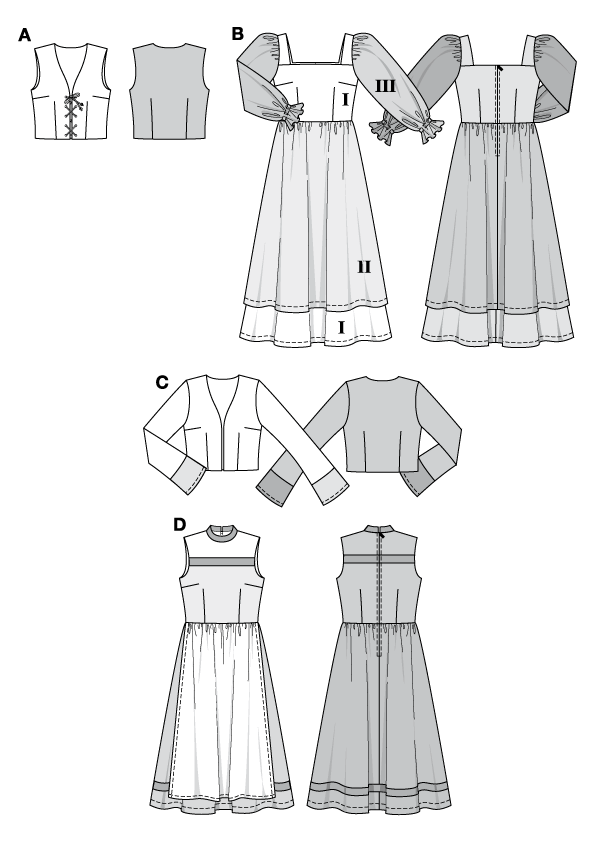 Patrones Burda de 2 originales vestidos con chaqueta y chaleco de época.