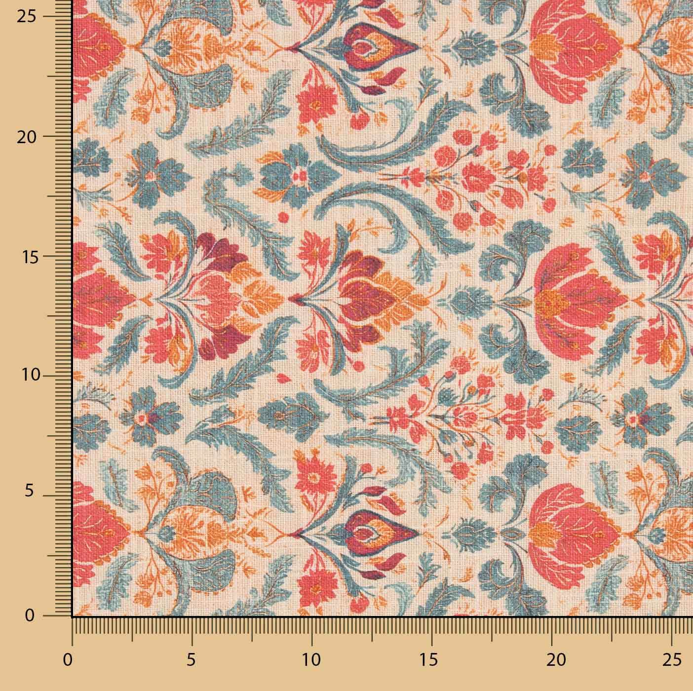 100% cotton canvas fabric, 280 cm wide, with a digital print of large ornamental flowers in shades of red and coral and blue-green leaves on a light background. Its symmetrical floral design, inspired by classic styles, brings an elegant and decorative touch, ideal for adding personality to any space. The digital print offers high definition in the details and vivid colours. It is a resistant fabric with body and a natural feel, perfect for making curtains, cushions, tablecloths, bedspreads, light upholstery and all kinds of decoration and craft projects.