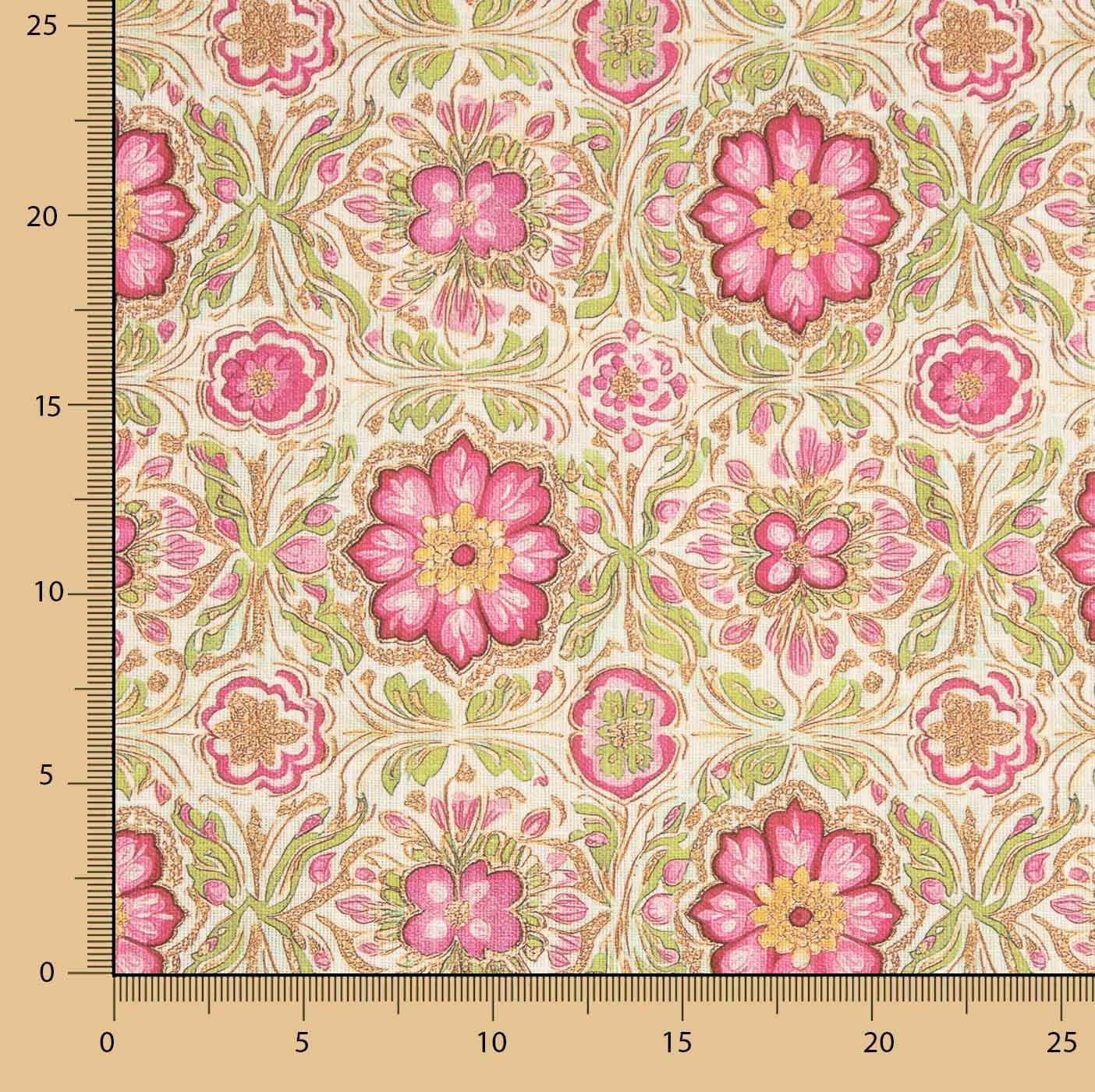 100% cotton canvas fabric, 280 cm wide, with a digital print of pink flowers and green details on a light background with a greenish tint. Its ornamental floral design gives it a cheerful and decorative look, with bright colours and high definition thanks to the digital printing. It is a resistant fabric with body and a natural feel, ideal for making curtains, tablecloths, cushions, light upholstery, bags and all kinds of decoration and craft projects that require a wide and versatile fabric.
