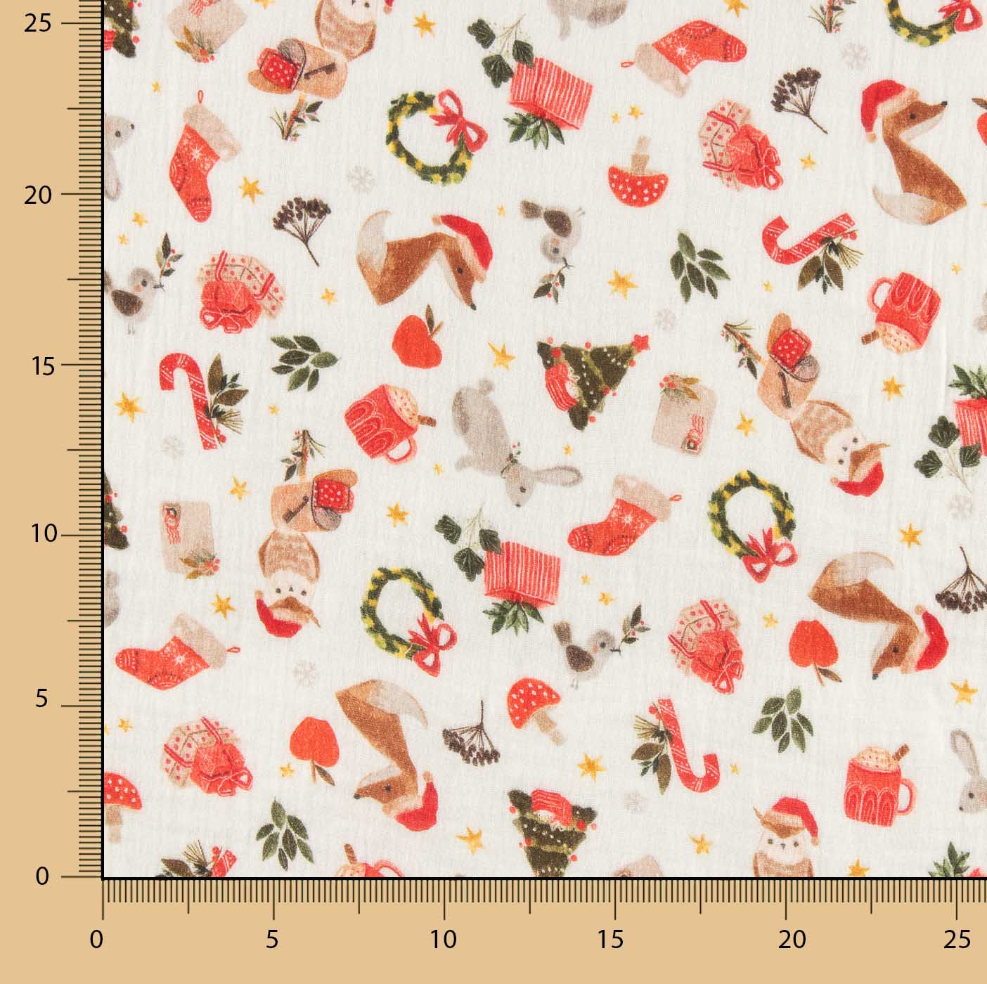 Organic cotton bambula fabric with a Christmas animal print. Bambula, or double cotton gauze, is a cool, flowing fabric characterised by the folds that form the structure and body of the fabric. It is a thin, opaque fabric, so it does not need any kind of lining. If you are looking for a quality fabric for summer dresses, skirts, trousers or shirts, cotton bambula will undoubtedly meet your requirements.