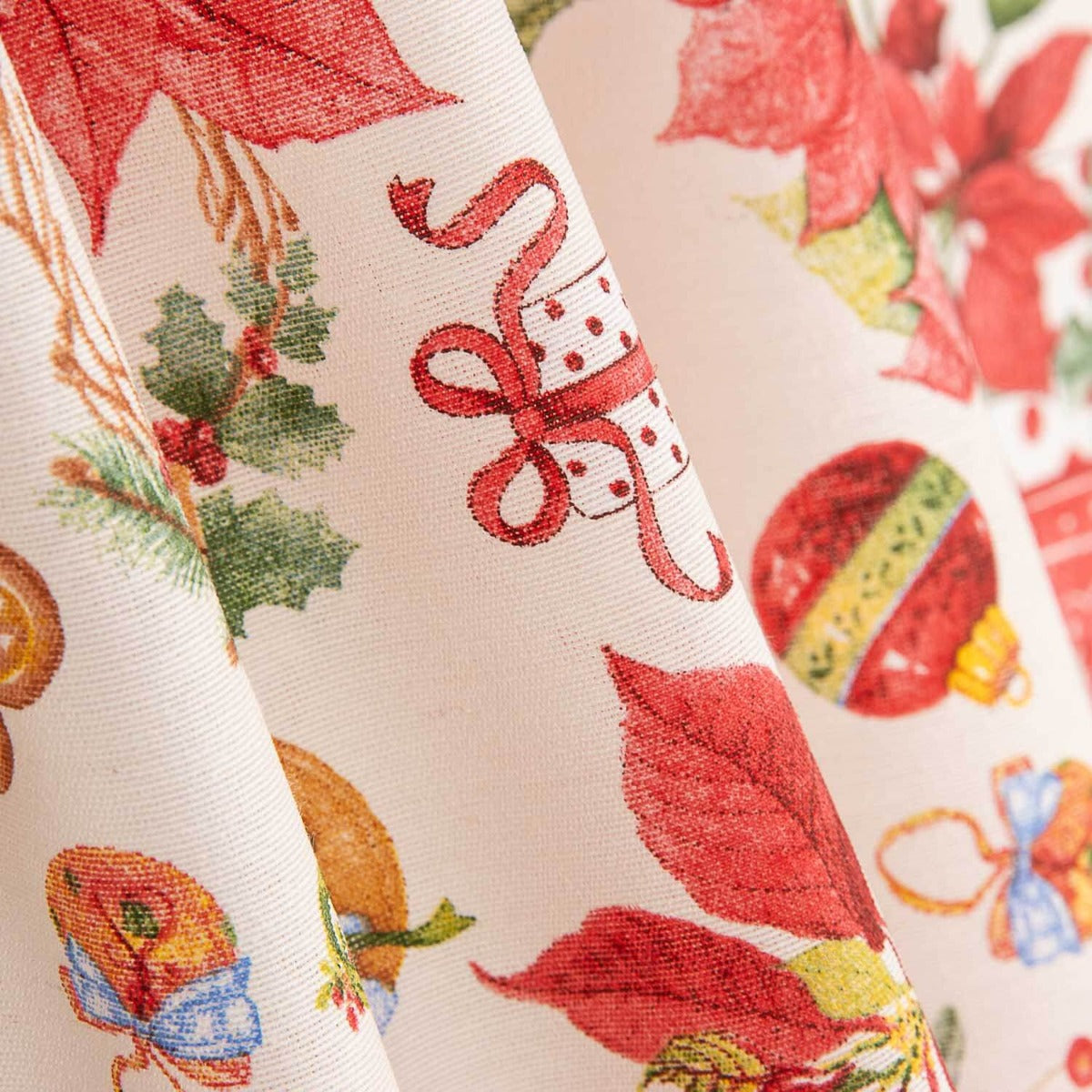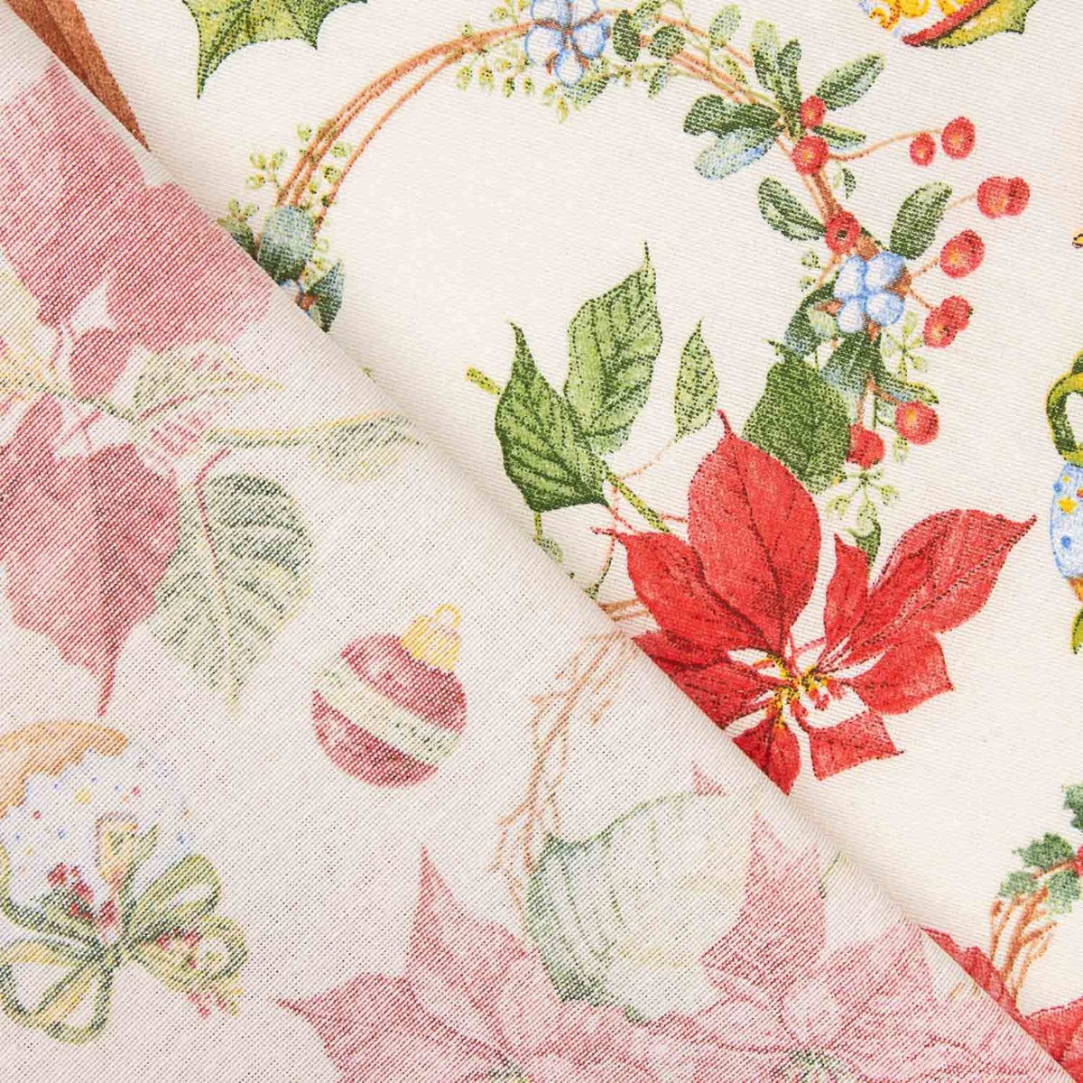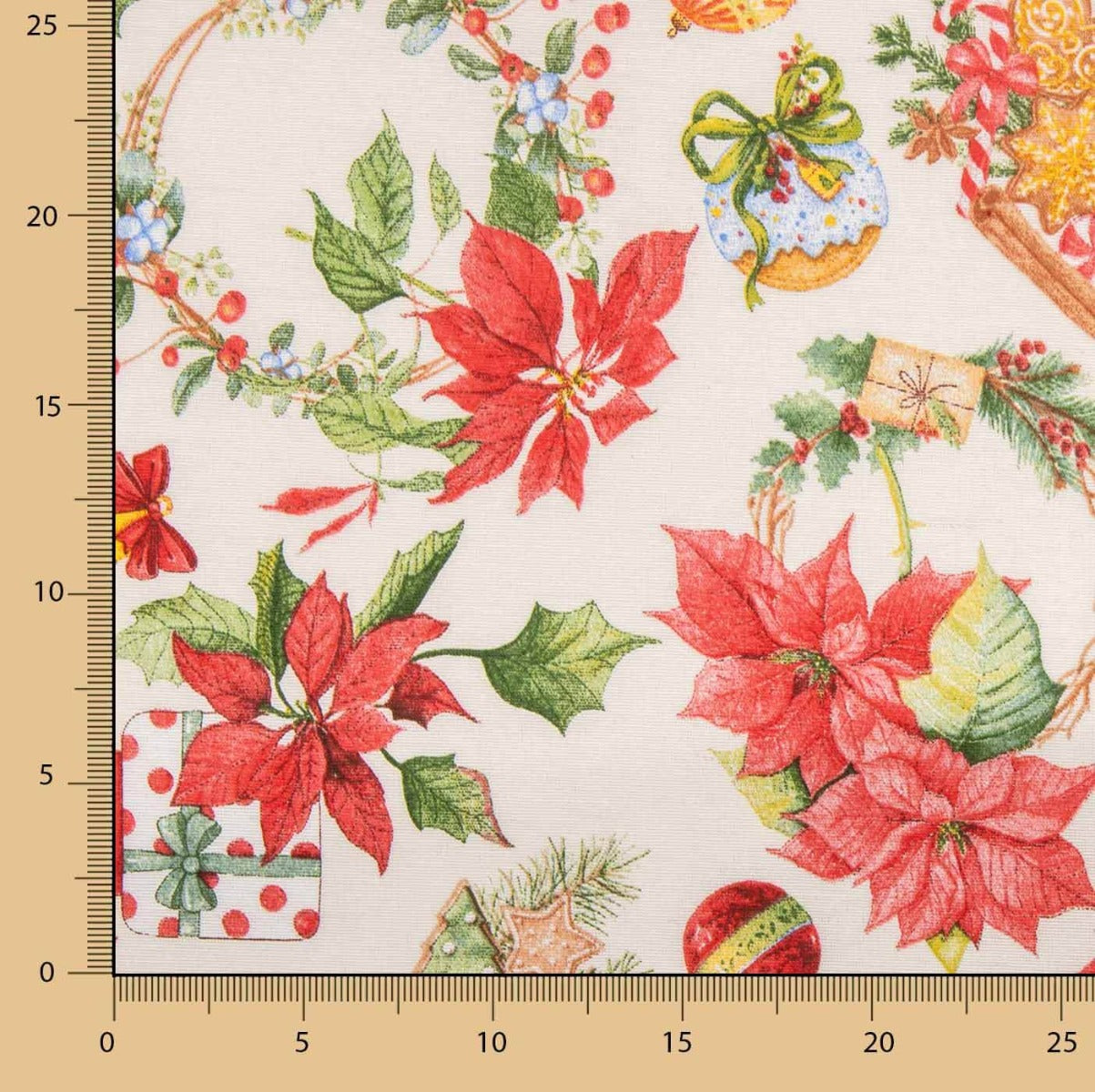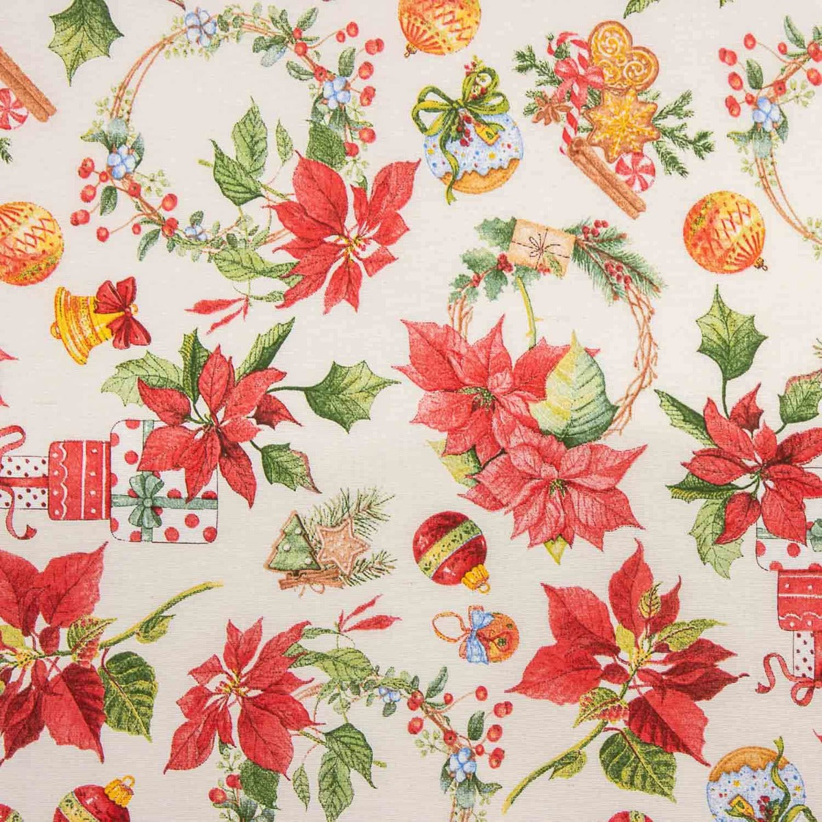 Su estampado combina todos los elementos esenciales de esta época del año: flores de pascua, coronas, bolas decorativas, regalos, ramas de acebo y galletas navideñas sobre un fondo beige rústico que aporta calidez y encanto artesanal.