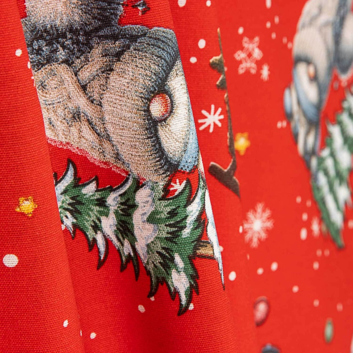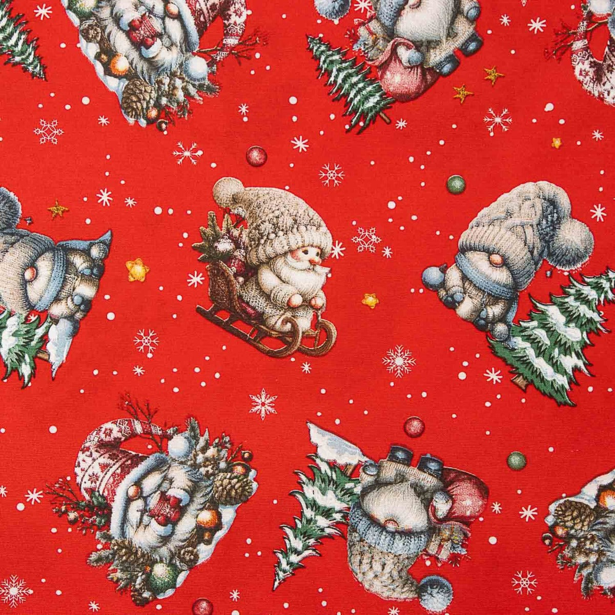 Su divertido estampado con gnomos invernales, muñecos de nieve, abetos y copos de nieve sobre un fondo rojo vibrante crea una atmósfera mágica ideal para decorar durante las fiestas.