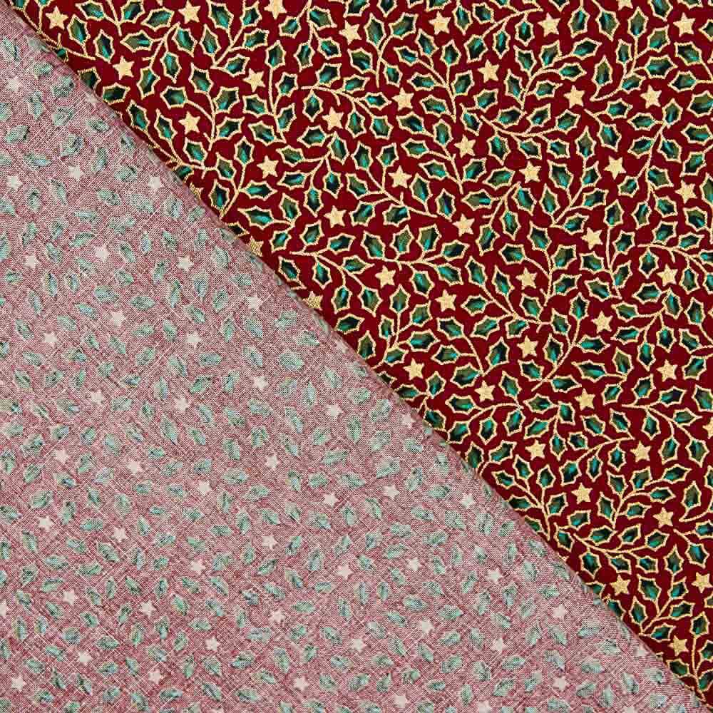Cotton poplin fabric with a mistletoe plant print with gold sparkles on a red background. Poplin is a very versatile, soft, fine and supportive cotton fabric. Cotton fabric perfect for Christmas decorations, tablecloths and patchwork.