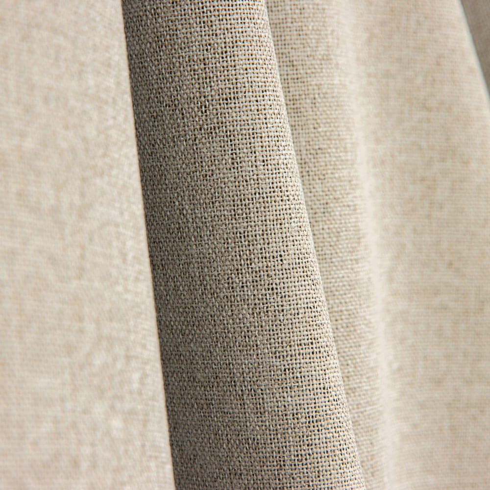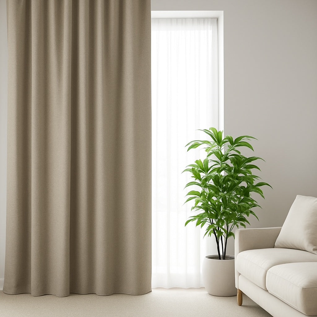 Tela black out total en beig. Tejido oscurante para cortinas. El black out es una tela para cortinas muy opaca, gruesa y caída, con acabado simulando falso liso.