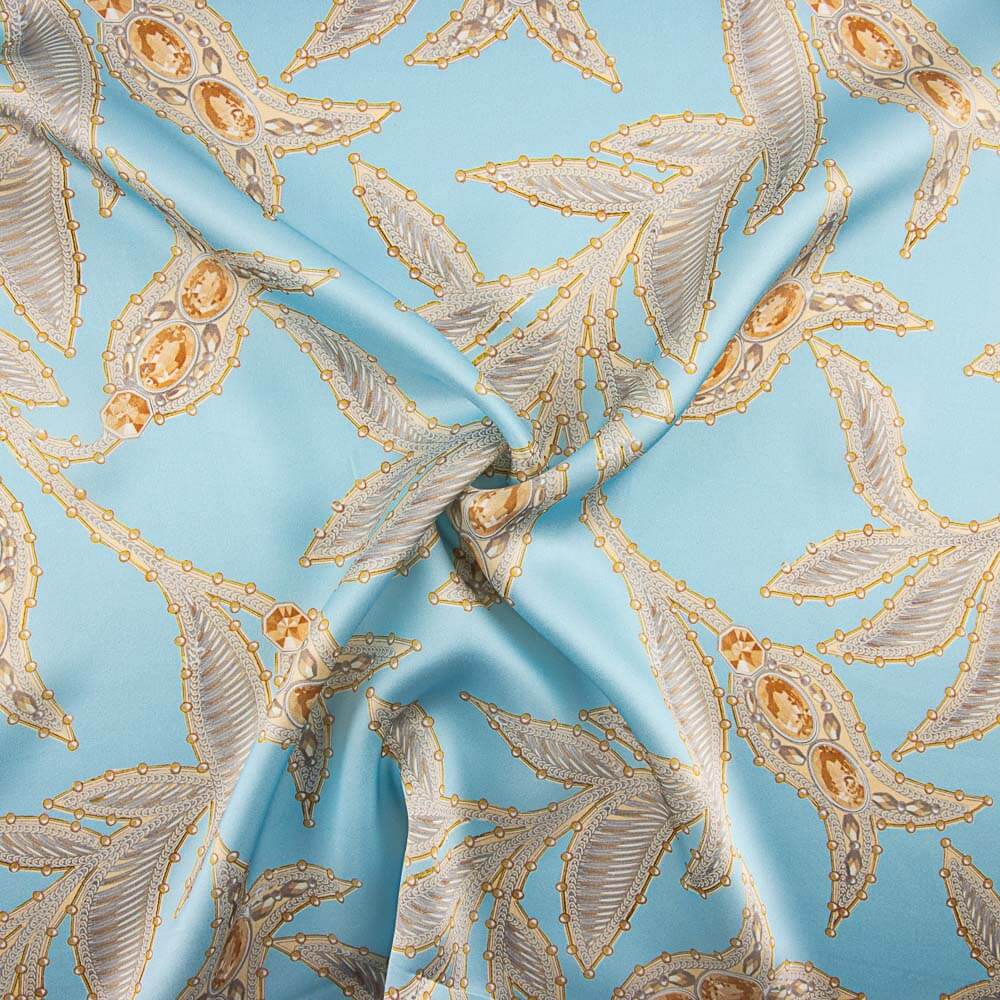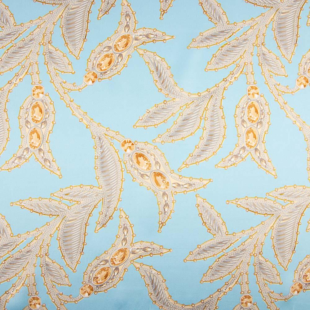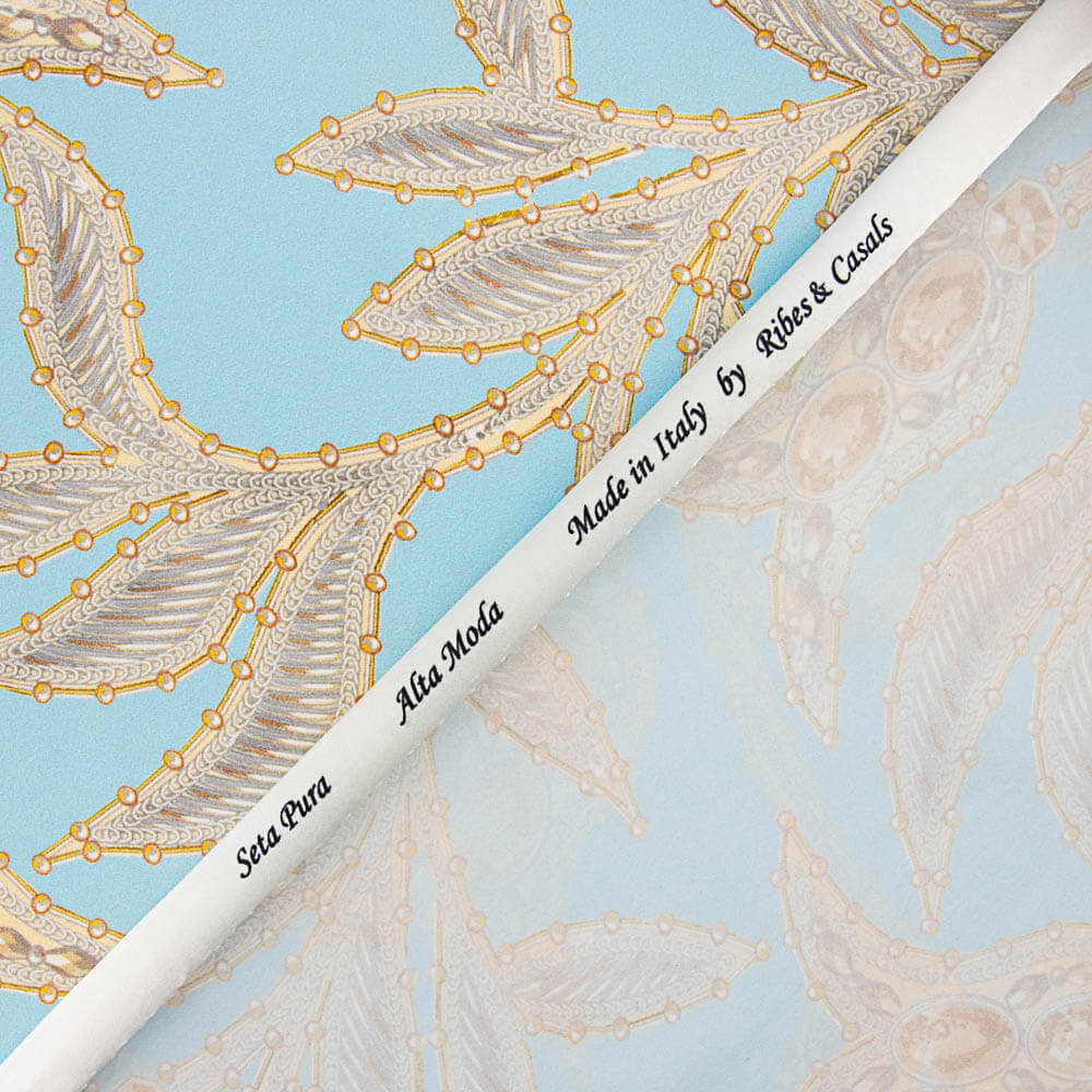 100% natural silk satin fabric with a gold abstract pattern on a porcelain blue background. The natural silk satin fabric with Ribes & Casals exclusive print fabric offers a couture experience with its combination of luxury and exclusivity. The natural silk provides exquisite softness and a sumptuous sheen, while the exclusive printing process ensures unique and sophisticated designs. This fabric is perfect for the sew of elegant and timeless garments, such as evening gowns and ball gowns, where every detail counts.