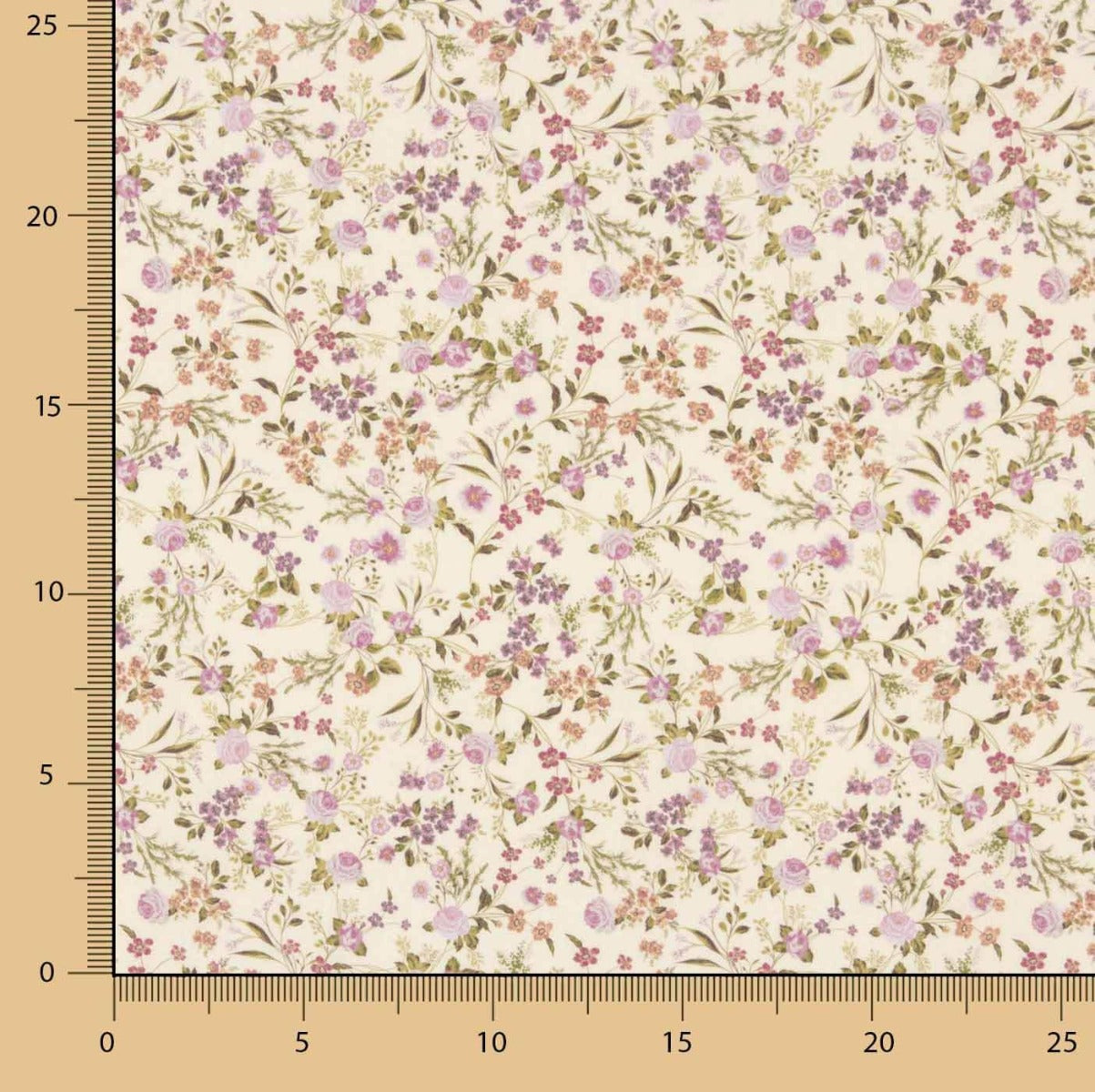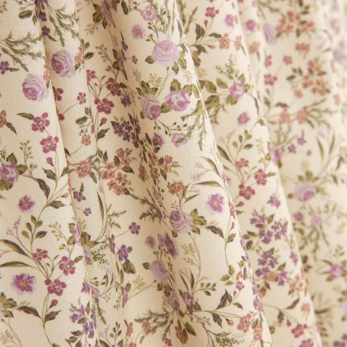 Inspired by the beauty of wildflowers, this printed cotton batiste fabric features a delicate floral design in lavender, pink and olive green tones on a raw cotton background—ideal for garments with natural charm. Made from 100% cotton, its lightweight structure is breathable, soft to the touch and has a gentle warmth similar to fine flannel. The spaced-out, organic design gives it a fresh visual appeal and timeless style. Perfect for sewing blouses, dresses, shirts, children’s wear, accessories and home décor like cushions or light curtains, this fabric is easy to sew and well-suited to romantic, vintage or countryside-inspired projects.