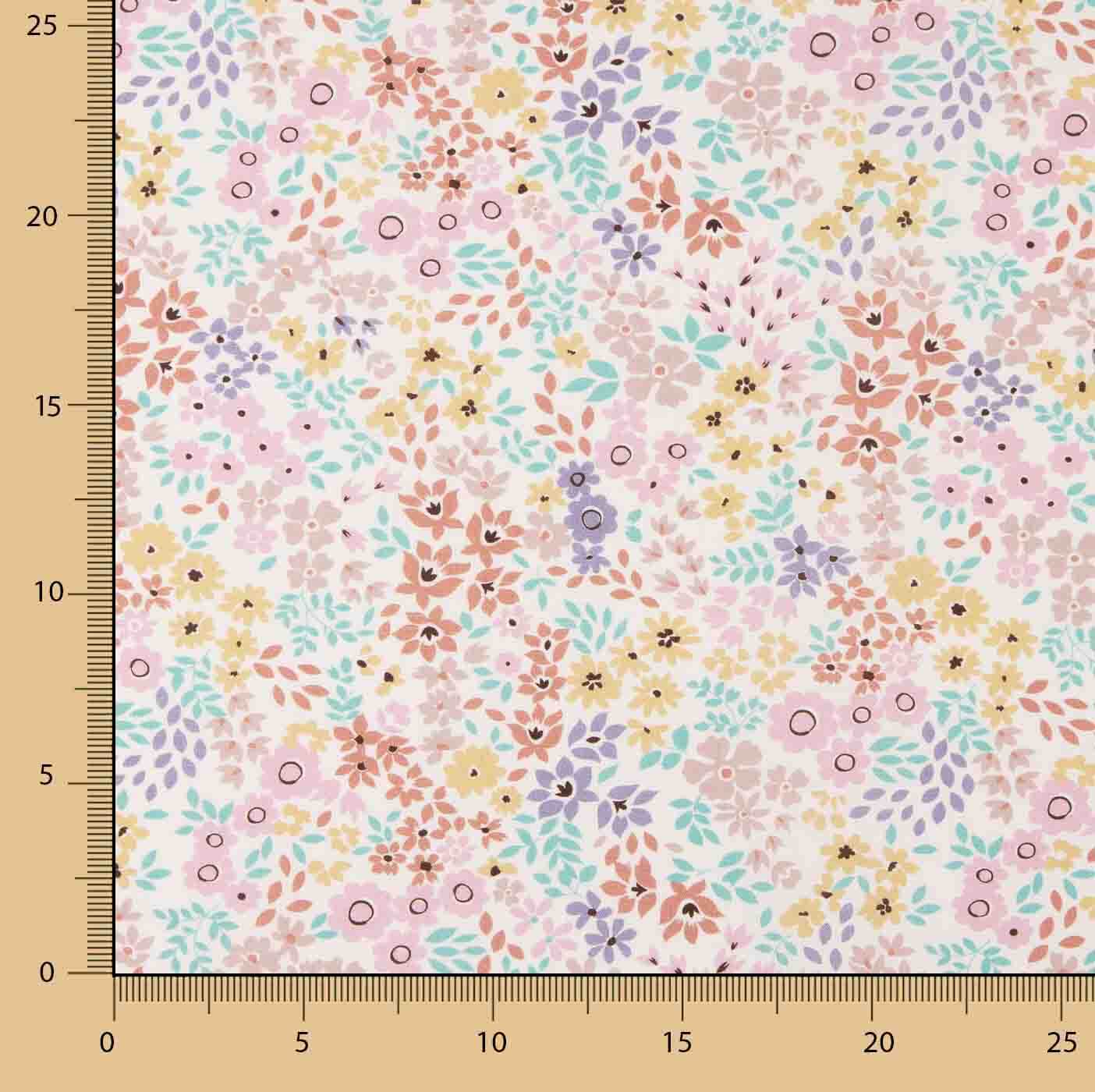 The Pastel Floral Print Cotton Poplin features a delicate floral design composed of small flowers and leaves in soft shades of pink, lilac, aqua green, peach and yellow on a light background. A sweet and harmonious print ideal for women's and children's clothing.