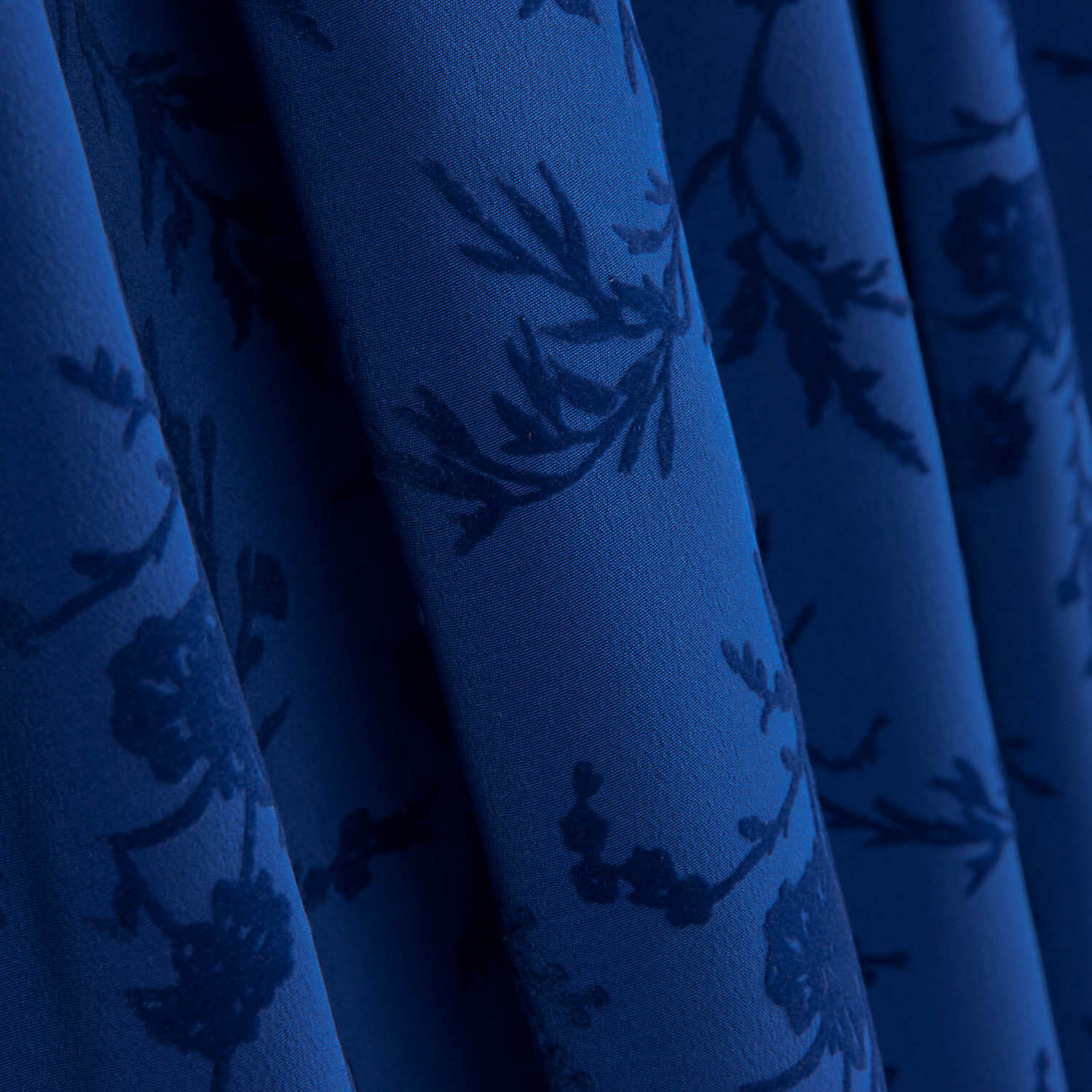 Exclusive 100% polyester koshibo crepe fabric in an elegant blue tone with embossed flocking of flowers and branches in intense blue, designed for the Ribes & Casals flamenco catalogue. Its slightly grainy finish and excellent drape bring fluidity, volume and movement to any flamenco design. Koshibo is a lightweight, resistant fabric with magnificent drape, highly prized in the manufacture of flamenco dresses for its comfort and ease of manufacture. The intense blue floral flocking creates a deep and sophisticated contrast, adding texture and elegance to designs with character and personality.