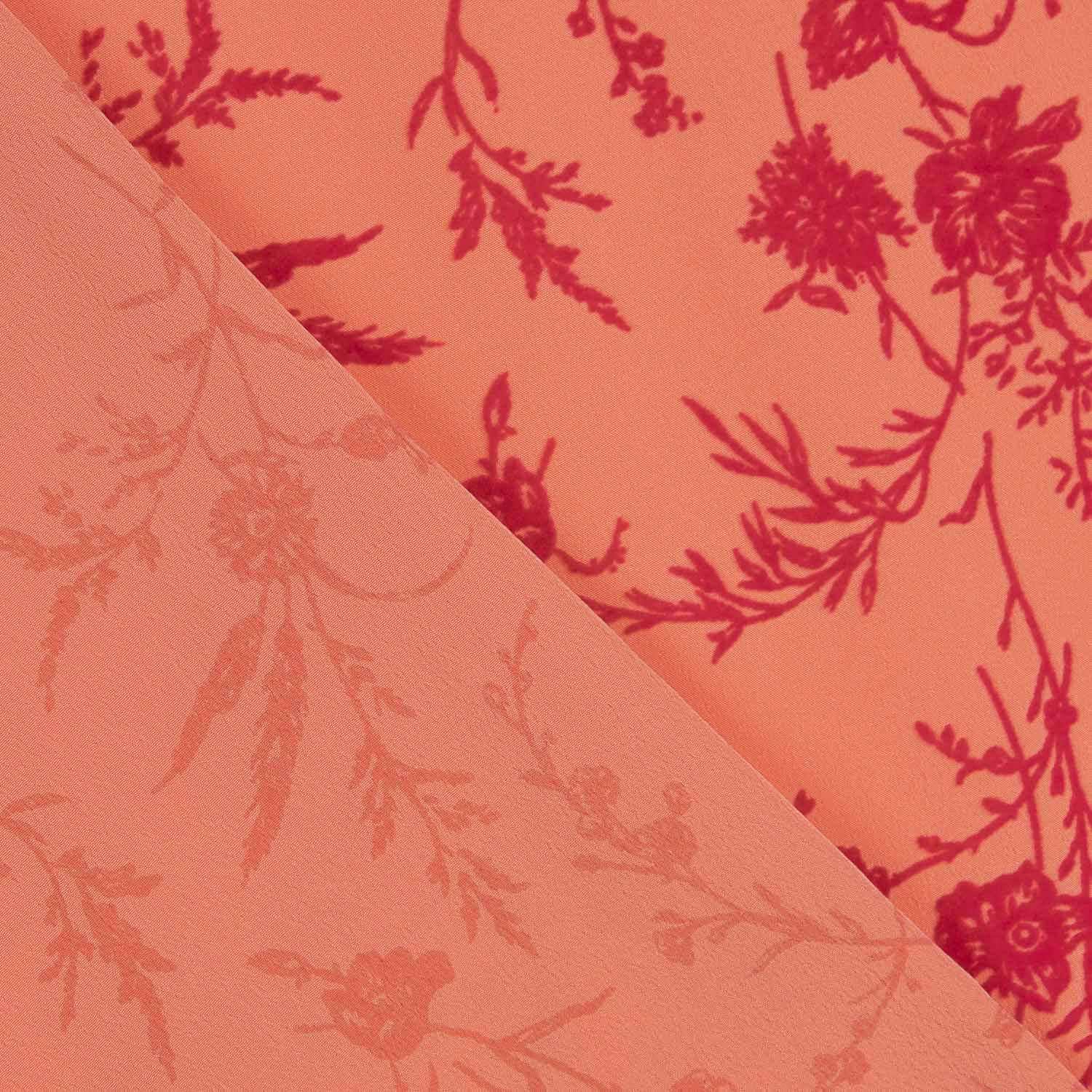 Exclusive 100% polyester koshibo crepe fabric in a vibrant coral tone with embossed fuchsia flowers and branches, designed for the Ribes & Casals flamenco catalogue. Its slightly grainy finish and excellent drape bring fluidity, volume and movement to any flamenco design. Koshibo is a lightweight, resistant fabric with magnificent drape, highly prized in the manufacture of flamenco dresses for its comfort and ease of manufacture. The fuchsia floral flocking creates an intense, feminine contrast, adding texture and depth for eye-catching designs full of personality.