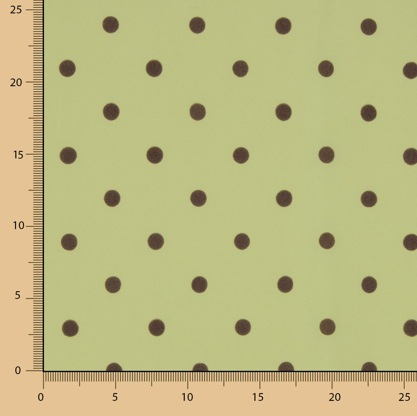 - Design: 1 cm flocked polka dots in khaki on a green background