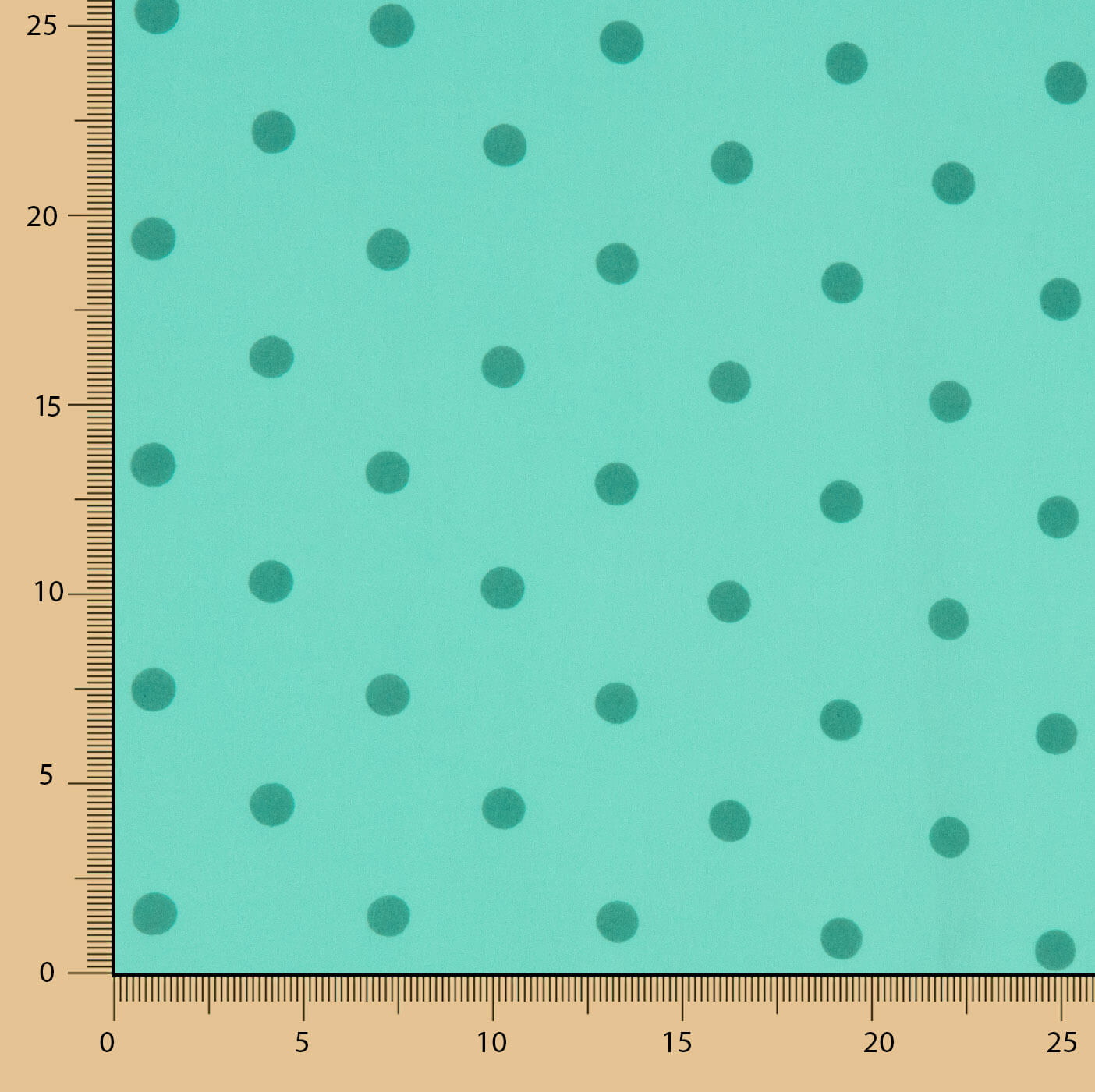 - Design: 1 cm flocked polka dots in green on a turquoise background
