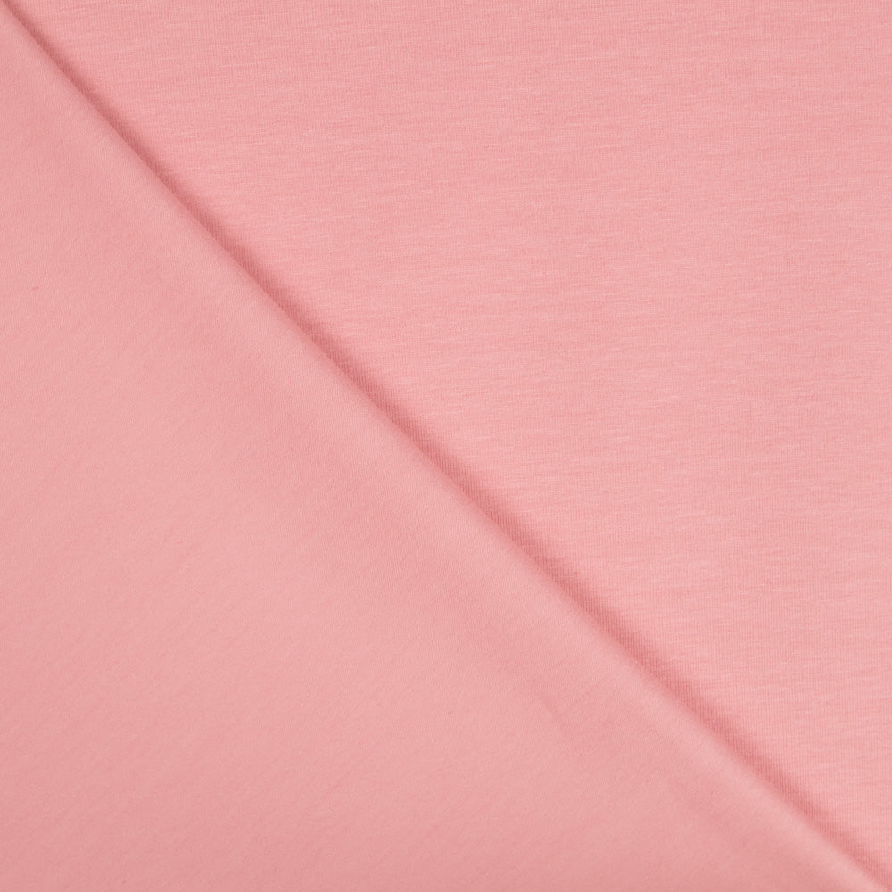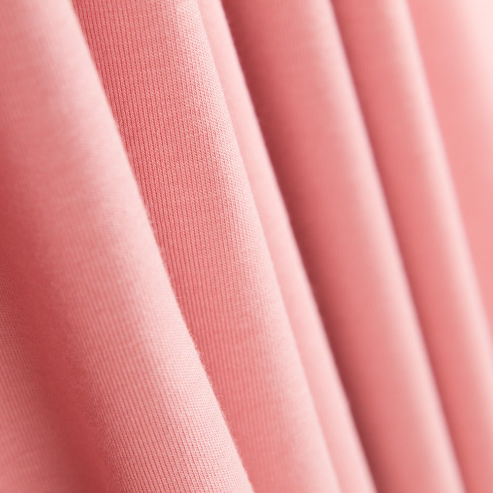 Punto elástico de algodón orgánico de color rosa maquillaje con certificado OEKO-TEX y GOTS (Global Orgánic Textile). Contiene un porcentaje de elastano que proporciona mayor comodidad y confort a las prendas. Punto para confeccionar camisetas, vestidos, faldas y pantalones, así como todo tipo de prendas ajustadas.