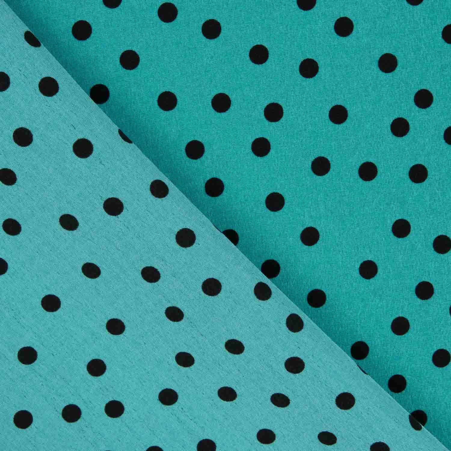 The Koshibo fabric with 7mm polka dots on an aquamarine washout background and black polka dots is an ideal choice for making fashionable garments with drape, comfort and style. It is a smooth, fine polyester fabric with a soft feel, highly prized for its fluidity and strength, perfect for warm climates and feminine designs. With a weight of 130 g/m² and a width of 150 cm, Koshibo is easy to work with and offers excellent performance in clothing projects. Its slightly grainy texture gives it a delicate finish, while its 100% polyester composition ensures durability, easy ironing and low maintenance. Ideal for blouses, skirts, loose dresses, flowing trousers and nightgowns, it is an essential staple for any wardrobe.
