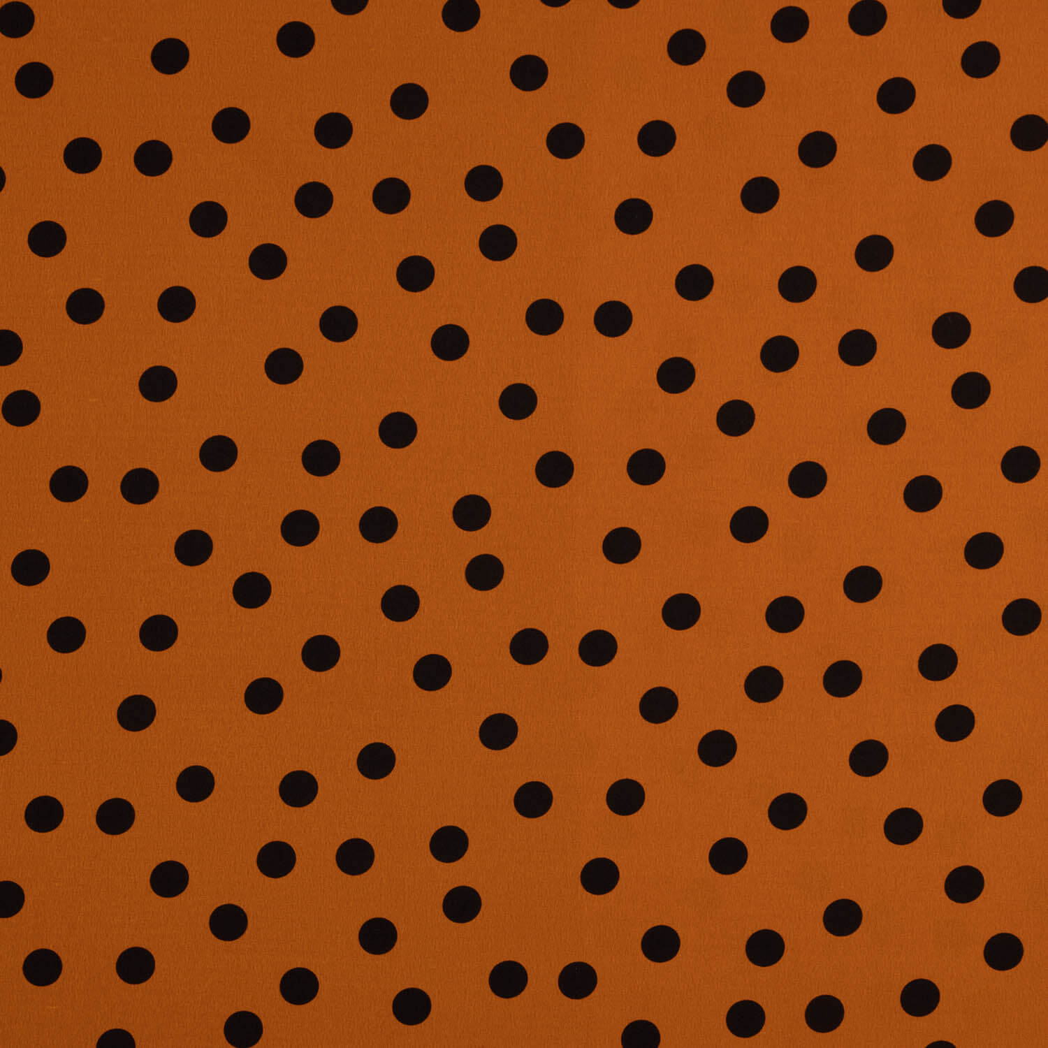 The Koshibo fabric with 17mm polka dots on a faded copper background and black polka dots is an ideal choice for making fashionable garments with drape, comfort and style. It is a smooth, fine polyester fabric with a soft feel, highly appreciated for its fluidity and resistance, perfect for warm climates and feminine designs. With a weight of 130 g/m² and a width of 150 cm, Koshibo is easy to work with and offers excellent performance in clothing projects. Its slightly grainy texture gives it a delicate finish, while its 100% polyester composition ensures durability, easy ironing and low maintenance. Ideal for blouses, skirts, loose dresses, flowing trousers and nightgowns, it is an essential staple for any wardrobe.