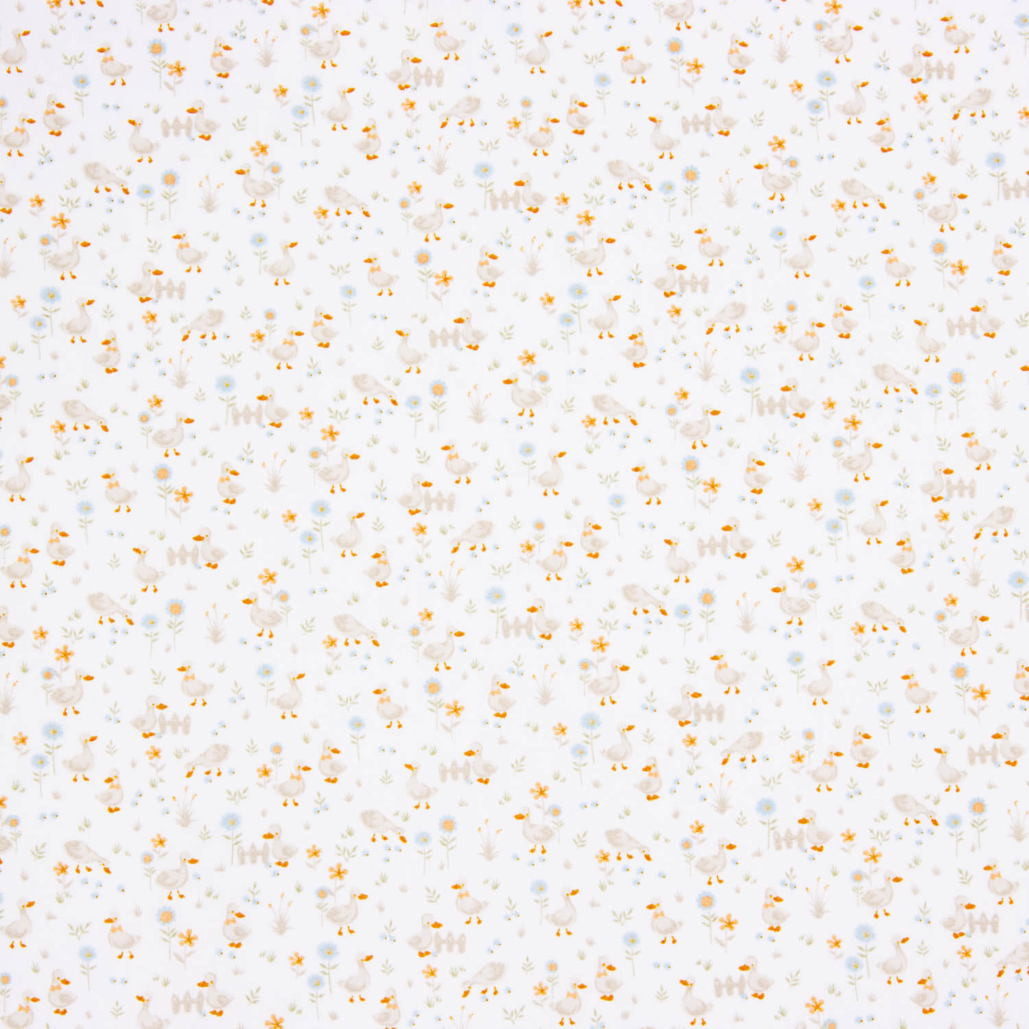 The Organic Cotton Poplin with Duck Print is a high-quality 100% organic cotton fabric with a delicate and charming print of ducks and small natural motifs, ideal for children's and creative sewing projects.