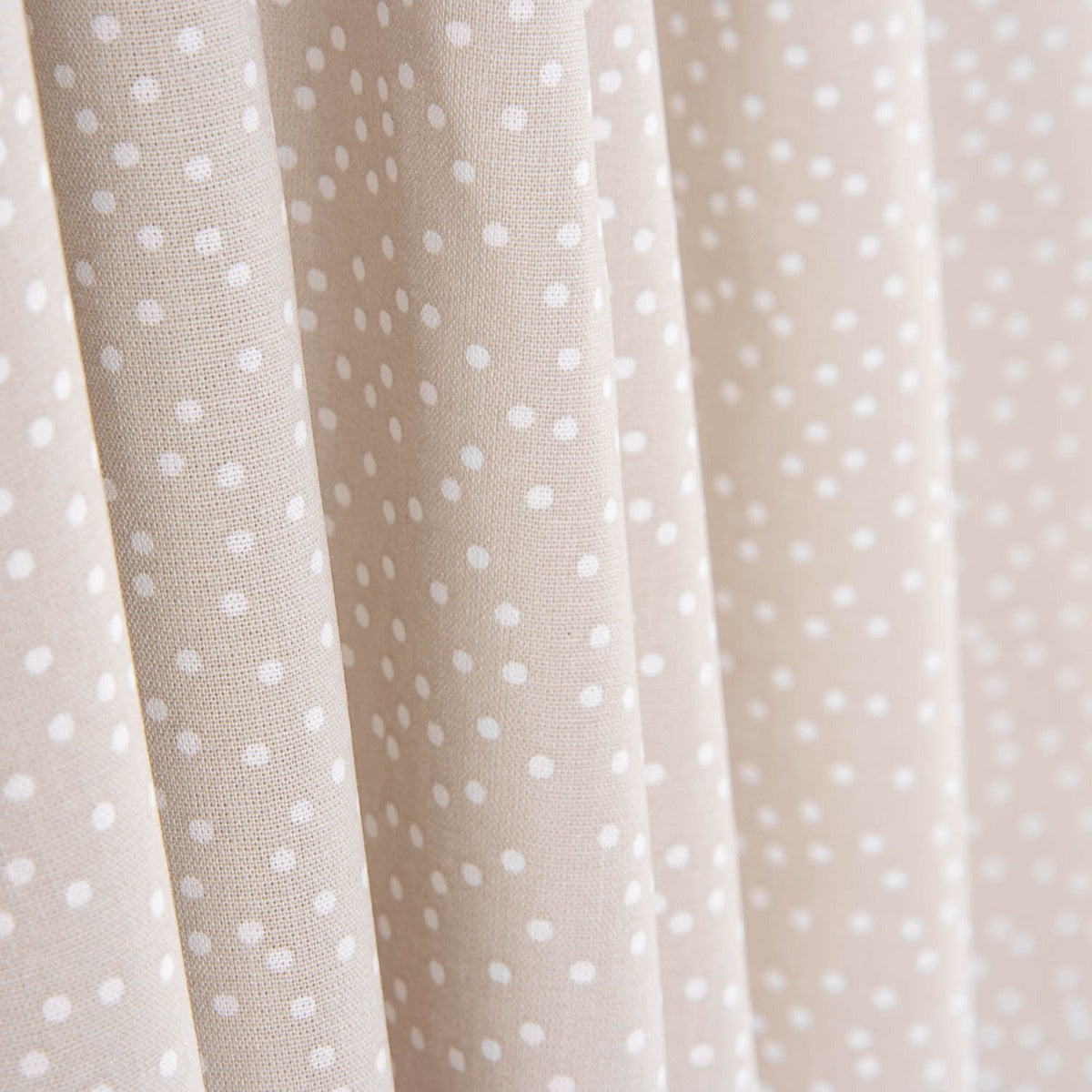 High-quality 100% cotton poplin with a white polka dot print on a light beige background. This fabric is perfect for patchwork, crafts, creative sewing and garment or accessory making where a subtle, modern and delicate design is desired. It has a soft touch, is opaque and has a light body, making it easy to handle both by hand and machine. Its natural composition ensures breathability and comfort, making it suitable for projects that come into contact with the skin. Pre-washing is recommended to avoid shrinkage.