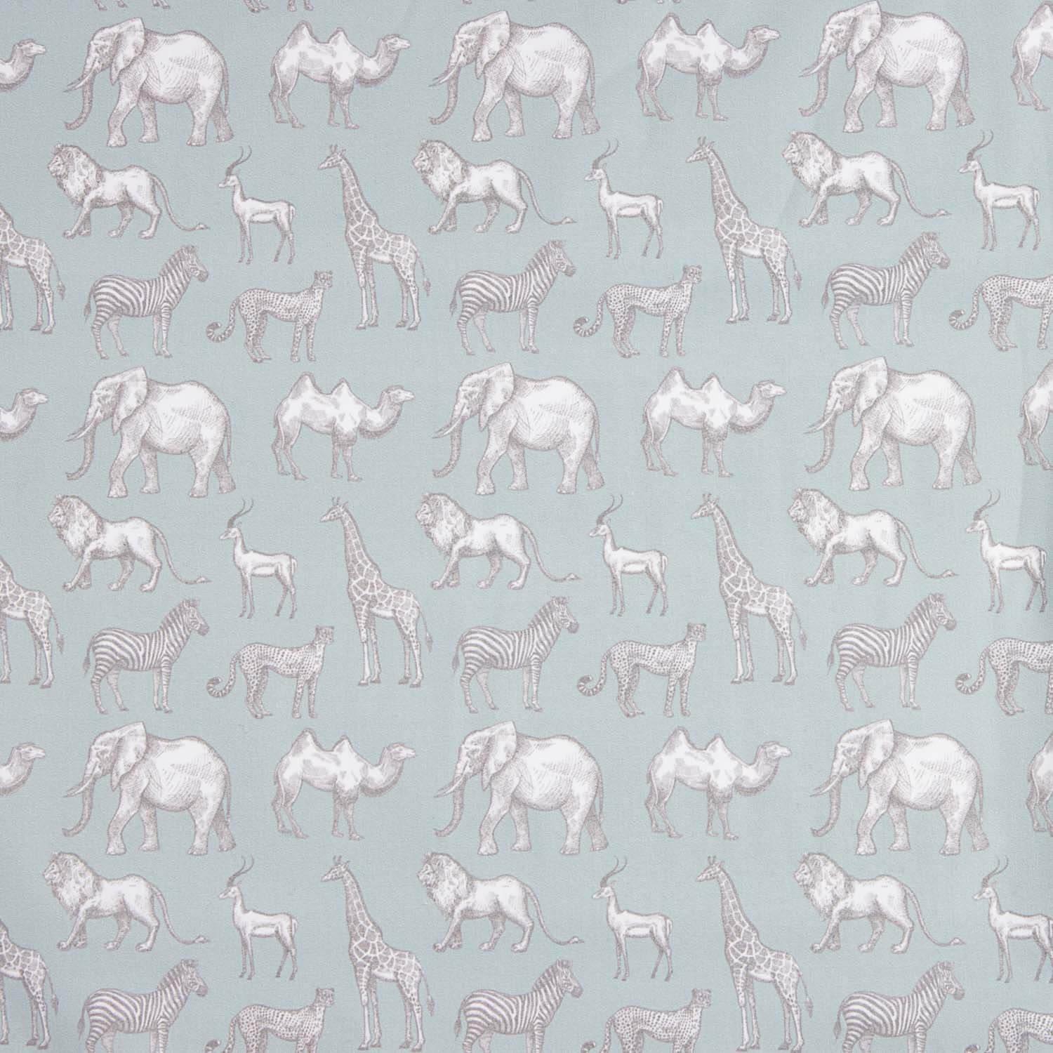 Safari Aqua Printed Percale made from 100% cotton and woven in 200 thread count percale, guaranteeing softness, freshness and great resistance. It features a delicate design of African animals — elephants, giraffes, zebras, lions and camels — in neutral tones on a sea green background, creating an elegant, natural print that is perfect for children's rooms or themed decorations.
