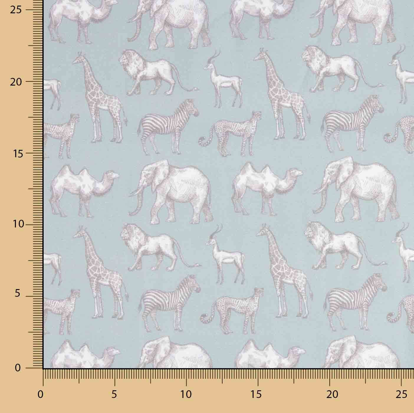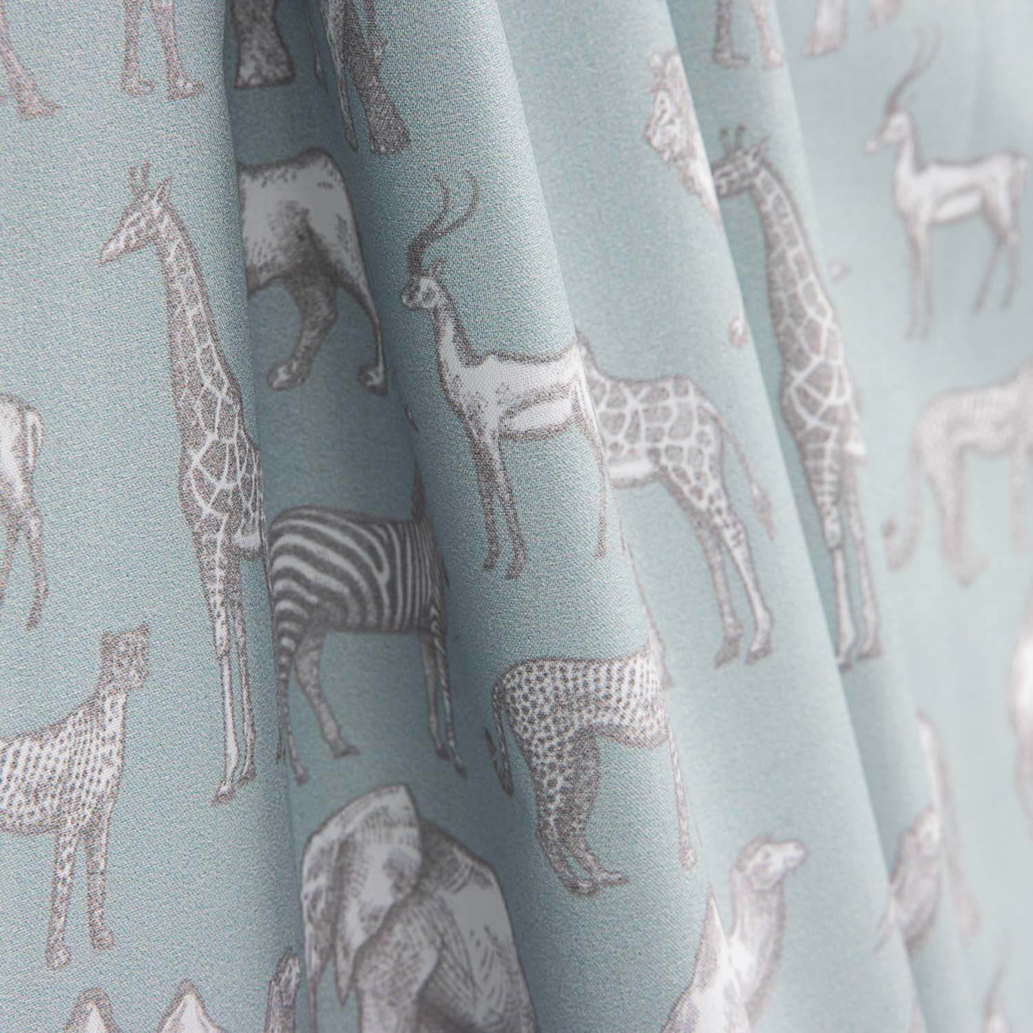 Composition: 100% cotton | Quality: 200 thread count percale | Width: 140 cm | Printing: High-definition digital | Design: Safari animals on a sea green background | Uses: Children's clothing, sheets, duvet covers, curtains, cushions and themed décor