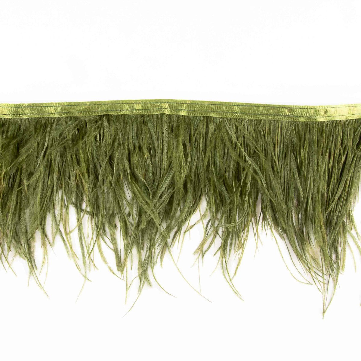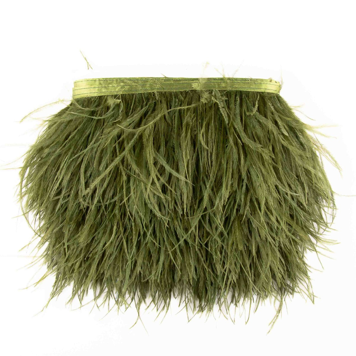 Ostrich natural feather fringe in Moss Green. With satin trim and a length between 12cm and 15cm. Unlike the other feather fringes, this one has a higher density of feathers. Ostrich feathers are known for their softness, lightness and fluffy texture, making them a distinctive and eye-catching embellishment in any design. These fringes are commonly used in evening gowns, couture garments and fashion accessories to add movement, sophistication and a touch of exoticism. Their luxurious appearance and ability to catch the light make ostrich feather fringes a popular choice for designers looking to create unique and dazzling pieces.