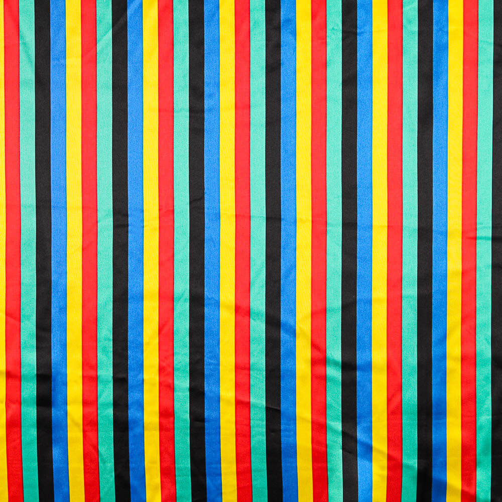 Tela para disfraces de estampado rayas multicolor. El raso carnaval es una tela muy sencilla, satinada y sostenida, muy fácil de confeccionar. Raso ideal para la confección de disfraces, para la decoración y espectáculos.