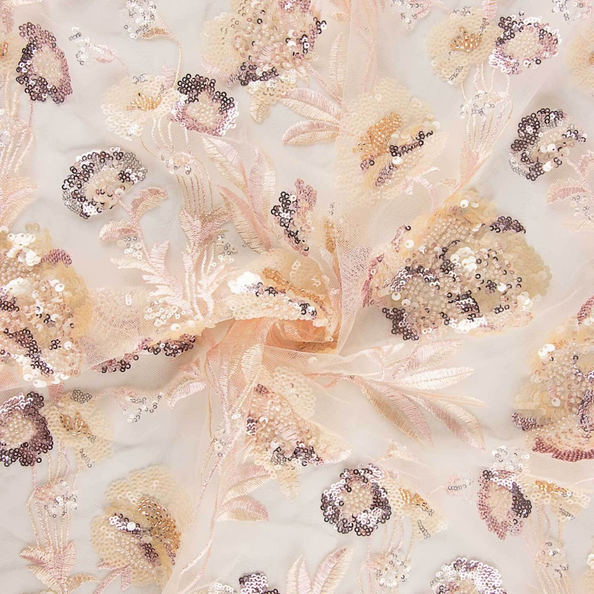 Tela de pedrería con lentejuela modelo primavera tono salmón con peso. Base de tul transparente de color blanco bordado con cristales y lentejuelas en tonos a juego que aportan destellos y brillos en tus creaciones.