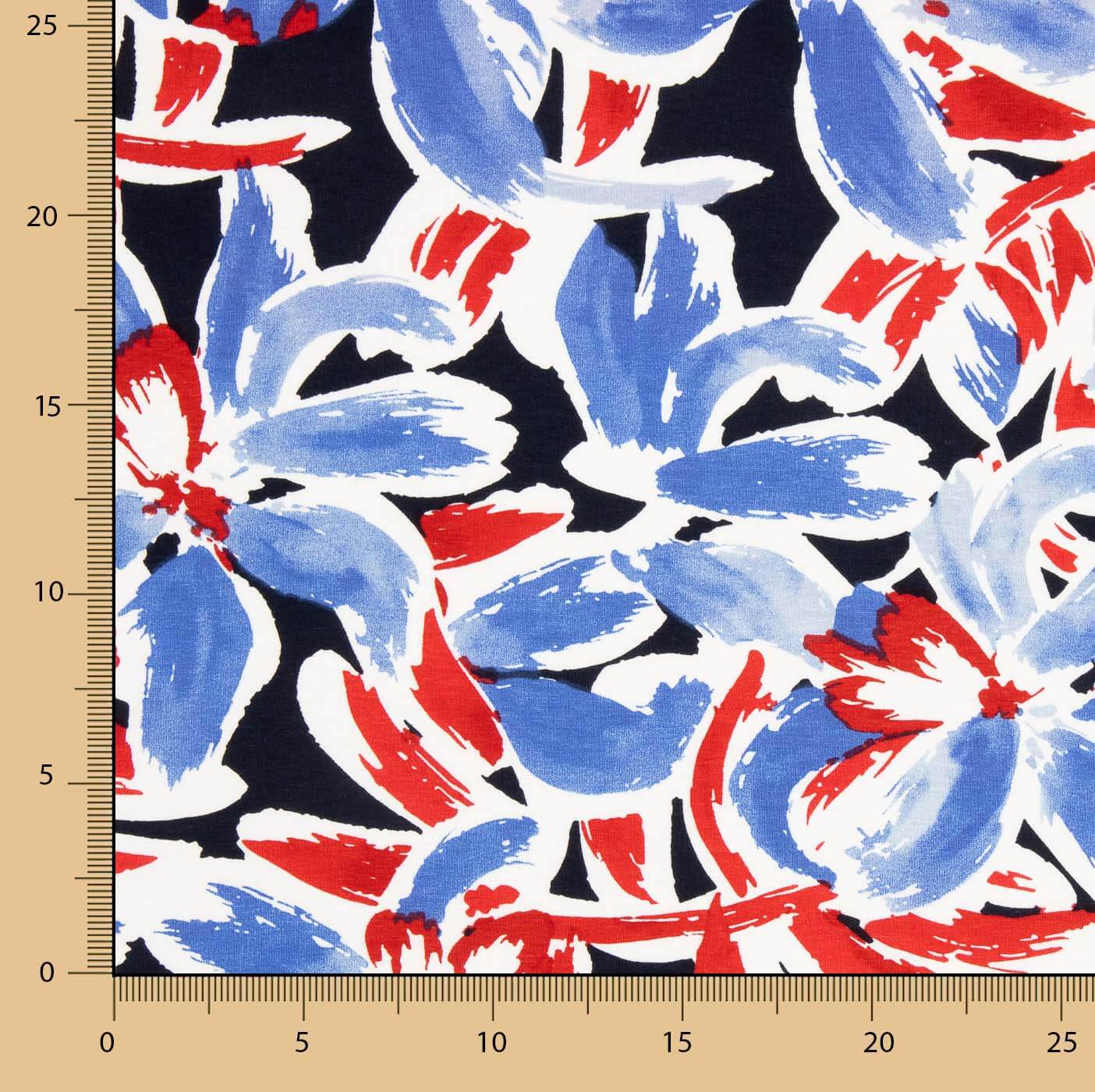 Bring freshness and character to your designs with this Blue and Red Floral Sailor viscose knit fabric, a jersey printed with an expressive floral motif in blue, red and white tones on a dark background. Its composition of 95% viscose and 5% elastane offers an extremely soft feel, comfortable elasticity and a fluid drape that adapts perfectly to the movement of the body. With a width of 145 cm, it is ideal for making dresses, T-shirts, skirts, blouses or loose and comfortable garments. A lightweight, breathable and very pleasant fabric, perfect for creating eye-catching garments with a modern, summery feel.