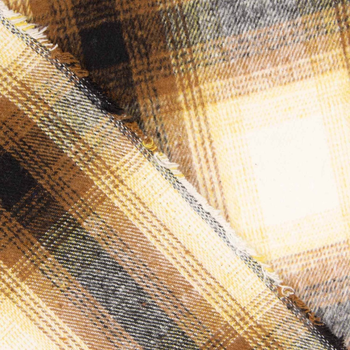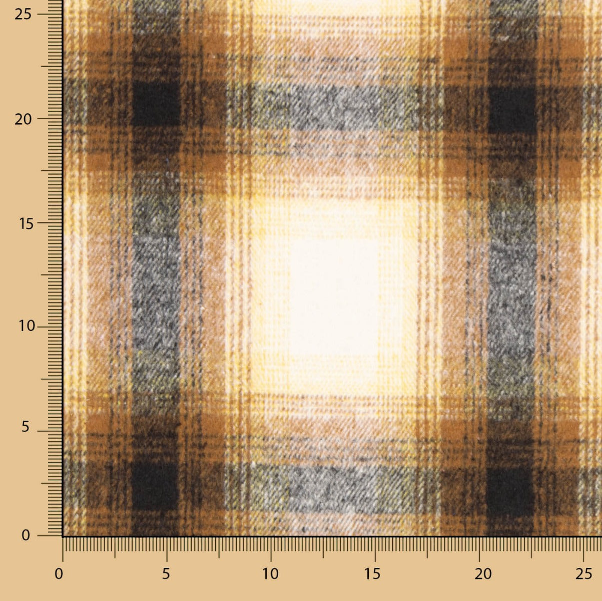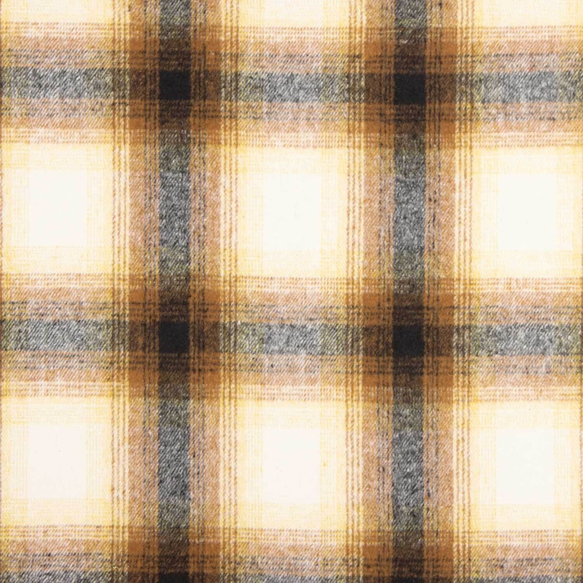 Mouflon fabric with a large check pattern in off-white, mustard, camel and grey, featuring a gently blurred effect that adds visual softness and a cosy aesthetic. Made from a blend of 40% polyester – 40% acrylic – 20% wool and measuring 150 cm wide, this fabric is perfect for sewing stylish and comfortable winter garments. Mouflon is a warm, soft-touch wool-like fabric with good body and drape, ideal for designs requiring both structure and fluidity. The warm and neutral palette is perfect for jackets, capes, ponchos, skirts or even rustic or Scandinavian-inspired winter accessories and home décor. Thanks to its synthetic fibre content, it is more durable and easier to care for than 100% wool, offering longevity without compromising on comfort.