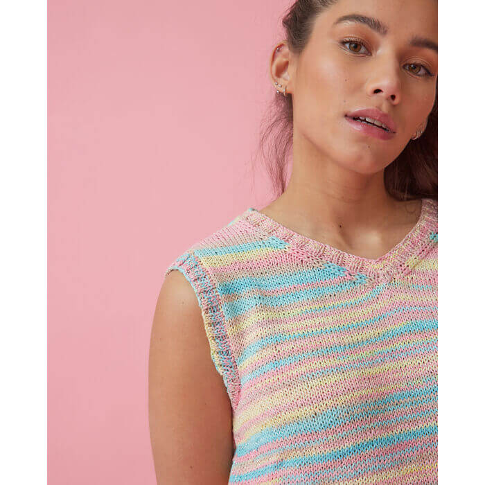 Pingouin Festival collection yarn, multicolour cotton yarn with a thin sheen. Perfect for knitting a variety of garments for spring, dresses, tops, accessories. Available in different colours. yarn of 50 grams and +/- 135 metres. Buy 9 yarns to knit a size 42 jumper, 6 yarns to knit a size 6 jumper.