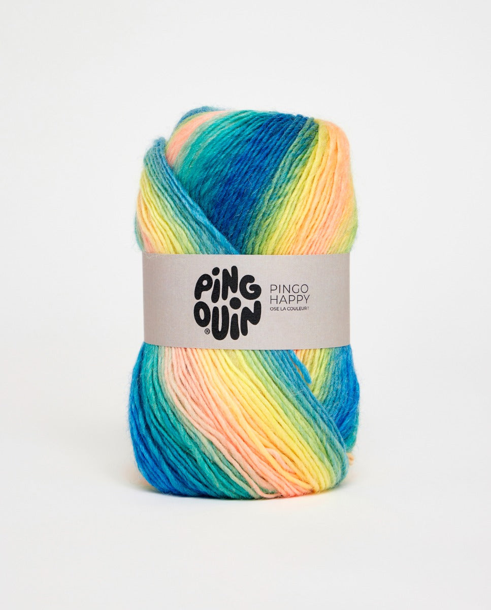 A curious yarn by Pingouin, Happy collection, combining a nice gradient of colours. Perfect to make original and coloured creations for autumn-winter. You will need only one yarn to knit an accessory, and 4 yarns to knit a pullover with size 4,5 needles. yarn of 100 grams and +/- 270 metres. Buy 4 yarns to knit a size 42 jumper, 2 yarns for a size 6 years jumper, 1 yarn for a size 3 months jumper.