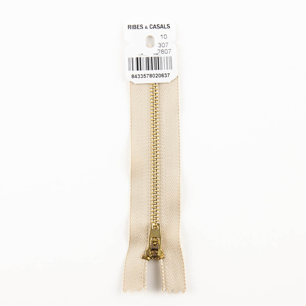 3 mesh zip with gold metal teeth on beige mesh. Very durable zip, ideal for jeans, bags and other applications where extra strength is needed. Available in various sizes, priced per unit.