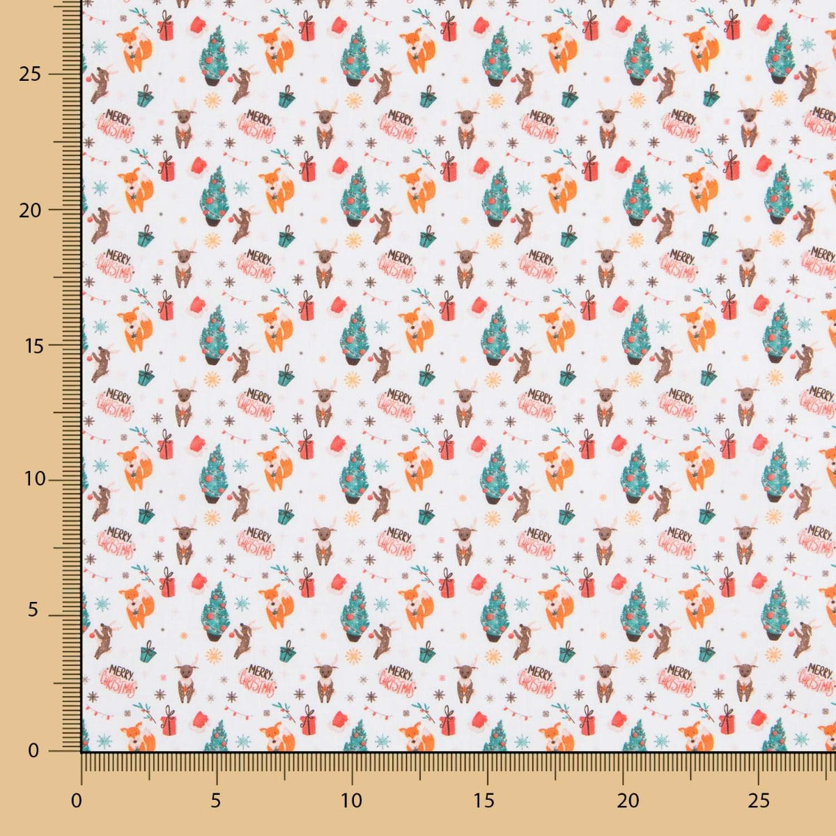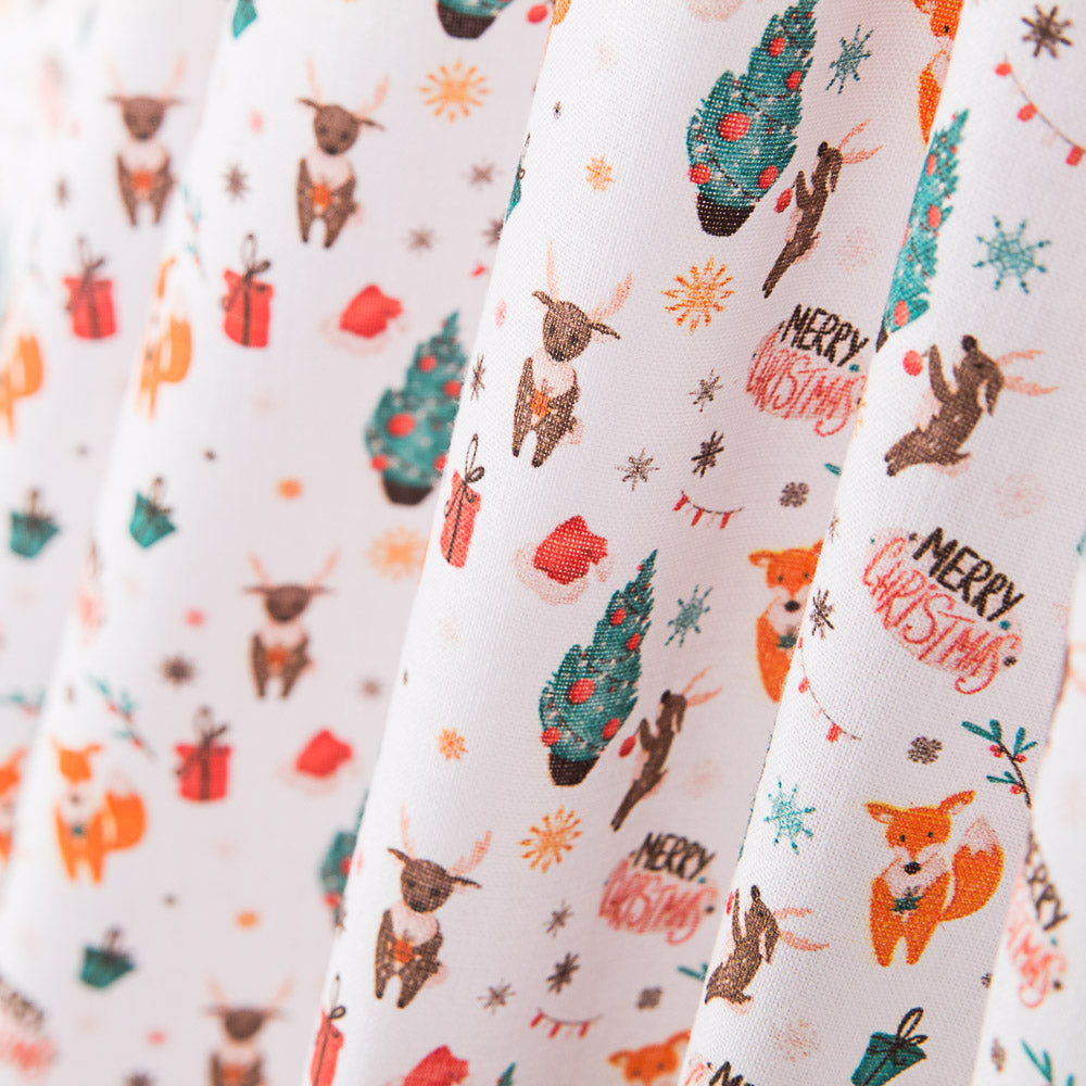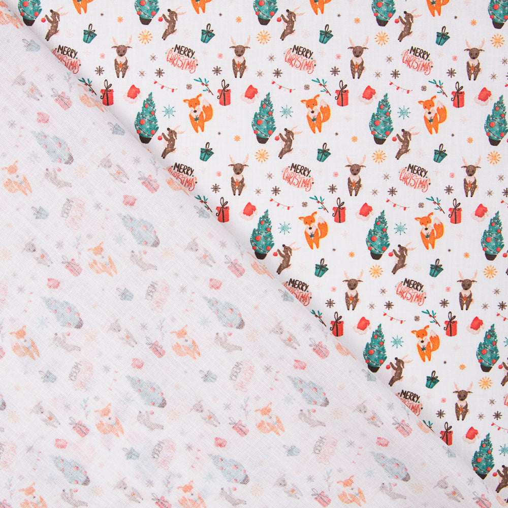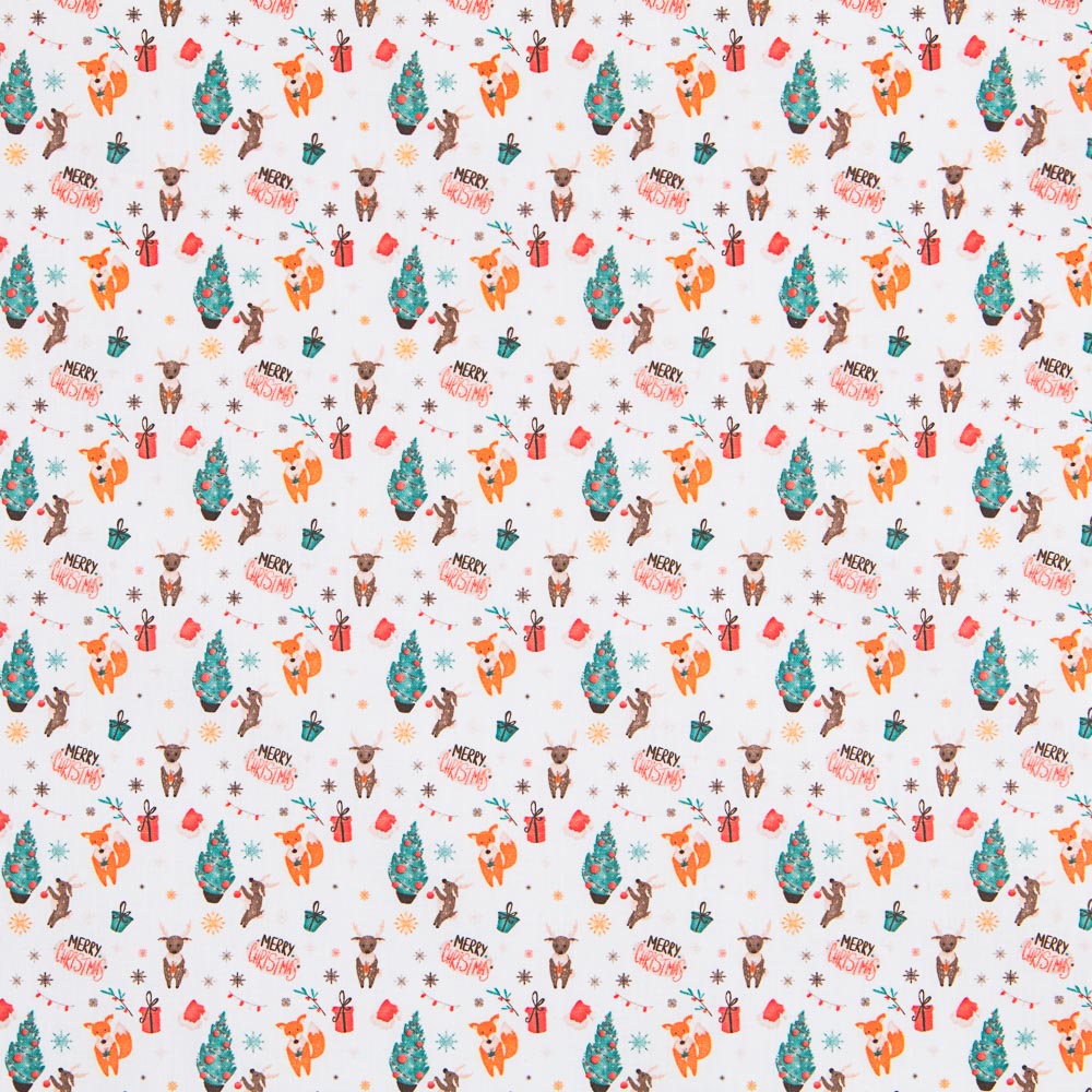 Tela de navidad estampada Navidad con fondo blanco. El popelín es una tela de algodón muy versátil, suave, fina y sostenida. Tela de algodón ideal para decoración de navidad, manteles y patchwork.