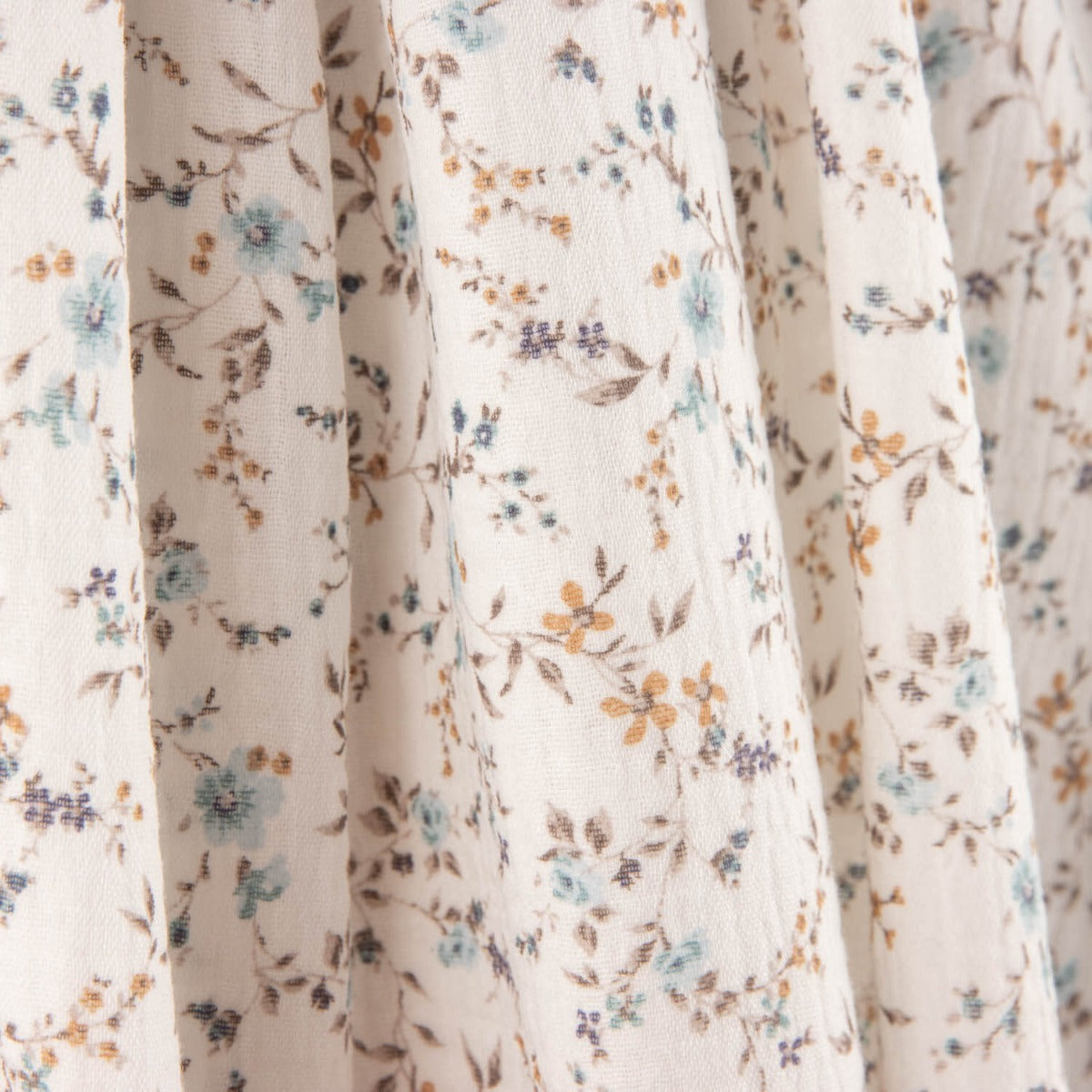 Esta tela de bambula estampada 100% algodón, con ancho de 148 cm, destaca por su estampado "Flores al Viento", una composición de ramitas y pequeñas flores en tonos azules, mostaza y malva sobre fondo claro.