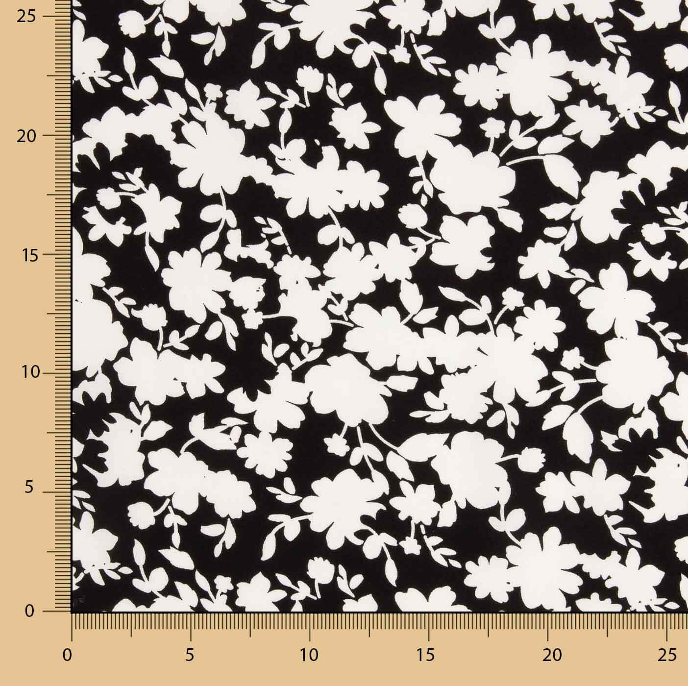 This floral printed viscose fabric features an elegant design of white flowers on a black background, creating a classic, sophisticated and highly versatile contrast. Made from 97% viscose and 3% elastane, it is soft to the touch, has a fluid drape and is slightly stretchy, improving the comfort and fit of the garment. With a width of 145 cm, it is ideal for making dresses, blouses, skirts, T-shirts, jumpsuits and flowing garments, providing natural movement and an elegant finish. A comfortable and easy-to-work fabric, perfect for both everyday looks and more refined designs.