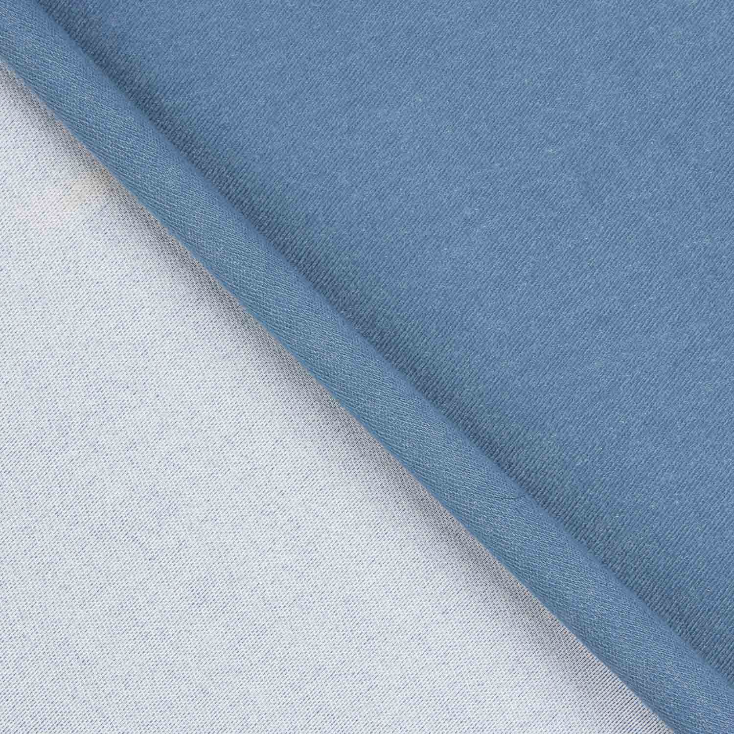 Plain blue denim knit fabric with a pre-washed finish and matte surface. It is 150 cm wide and weighs 300 g/m², offering body and resistance without compromising on comfort. Its composition is 60% cotton, 36% polyester and 4% elastane, which provides durability and slight adaptability to movement. It is an ideal fabric for making jackets, trousers, skirts and casual garments with a denim style, combining structure and comfort.