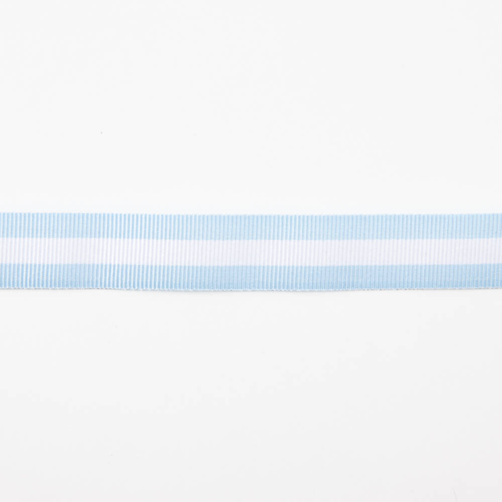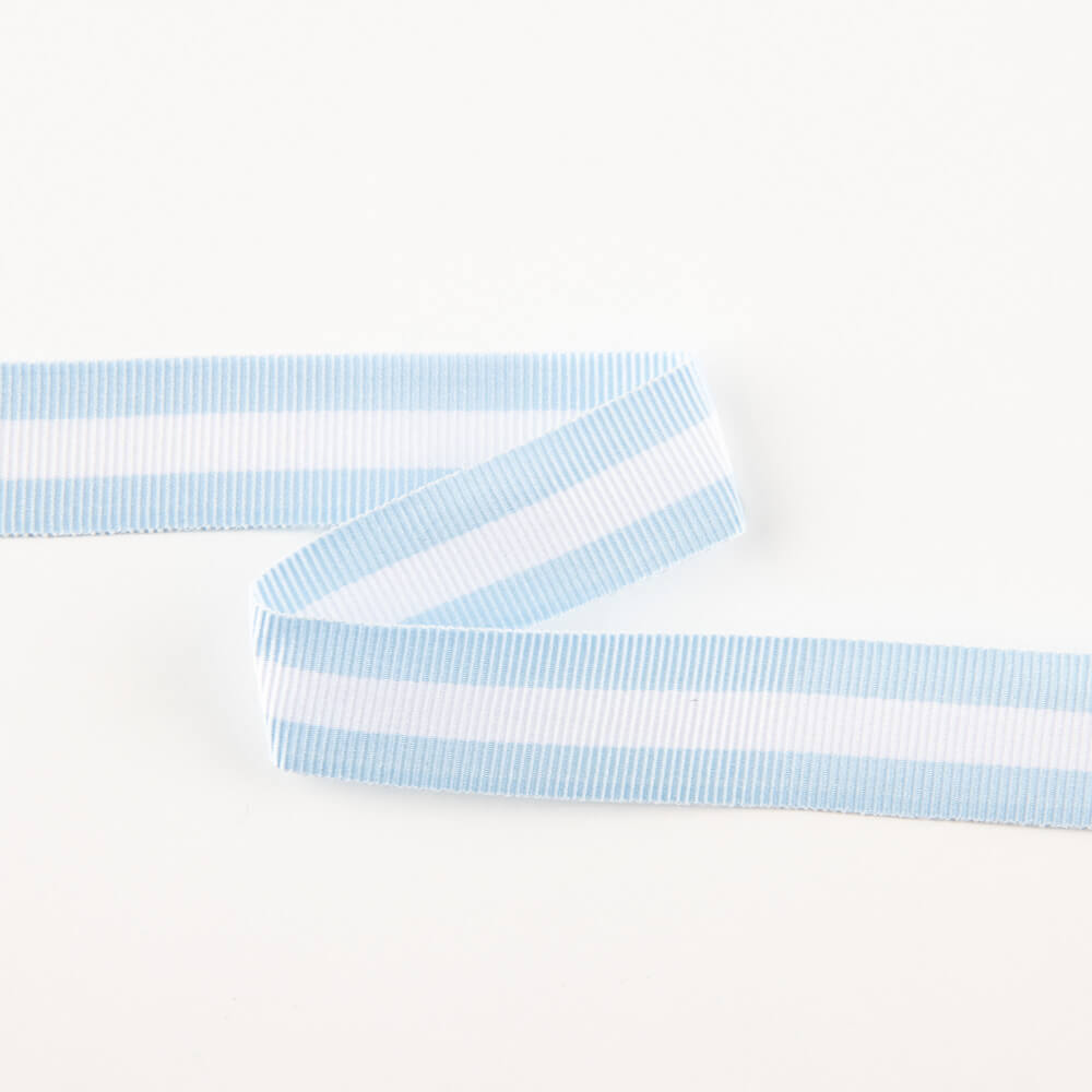 Bicolour striped ribbon of 15 mm width. Combines blue and white. Complete your creation with this striped ribbon, buy the metres you need from 1 metre. Price per metre.