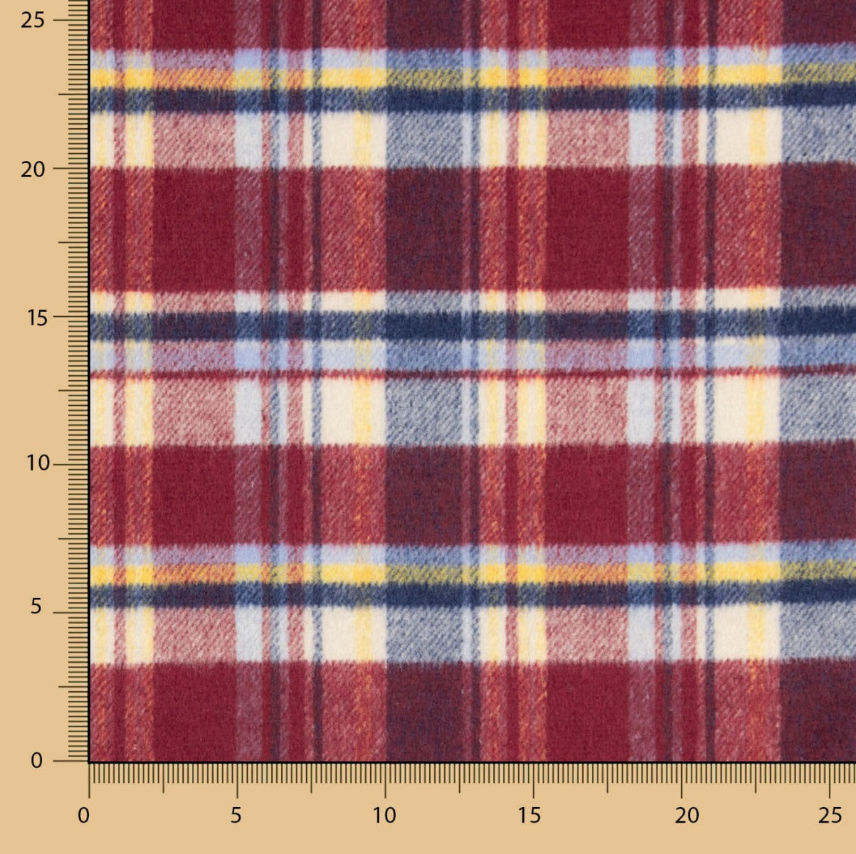 Mouflon fabric with a tartan check design in burgundy, navy blue, off-white, mustard and light grey – a vibrant and elegant palette that conveys warmth and classic style. With a width of 150 cm and a blend of 40% polyester – 40% acrylic – 20% wool, it’s perfect for crafting rustic or retro-inspired winter garments. Mouflon is soft to the touch, warm and structured – ideal for coats, jackets, overshirts, capes, skirts or ponchos. Its firm structure and fibre blend ensure good durability and easy care without compromising on comfort. This rich-toned tartan works beautifully in both men’s and women’s fashion and is also great for winter home décor projects.
