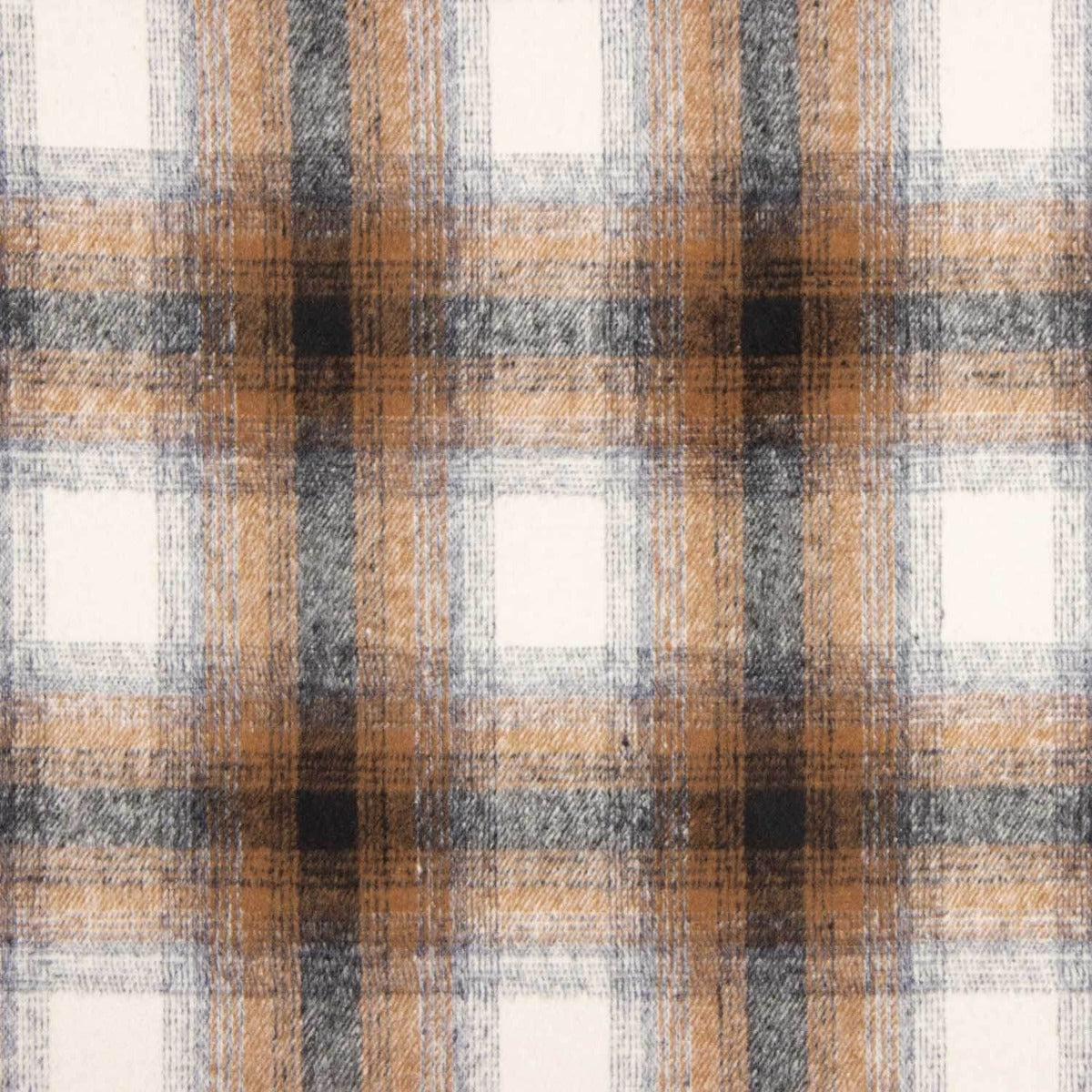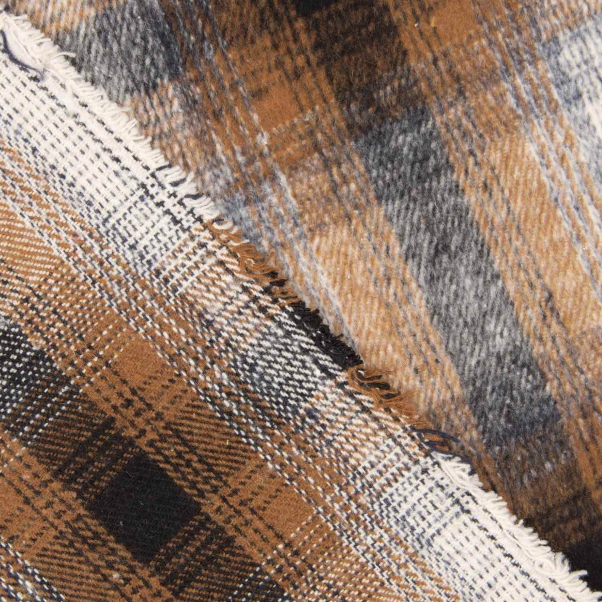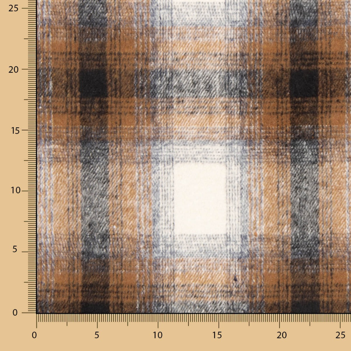 Mouflon fabric with a large check design in camel, grey, black and off-white, featuring a soft blurred effect for a warm, inviting look. With a blend of 40% polyester – 40% acrylic – 20% wool and 150 cm in width, this fabric is a fantastic option for classic and timeless outerwear. Lightweight and wool-like, it has a warm, soft handle with good drape and structure. The natural, earthy colour scheme is ideal for coats, jackets, capes, overshirts, ponchos or even decorative throws – perfect for rustic or Nordic-inspired styles. The synthetic content ensures durability and easier maintenance, helping the fabric maintain its look after regular wear and washing.