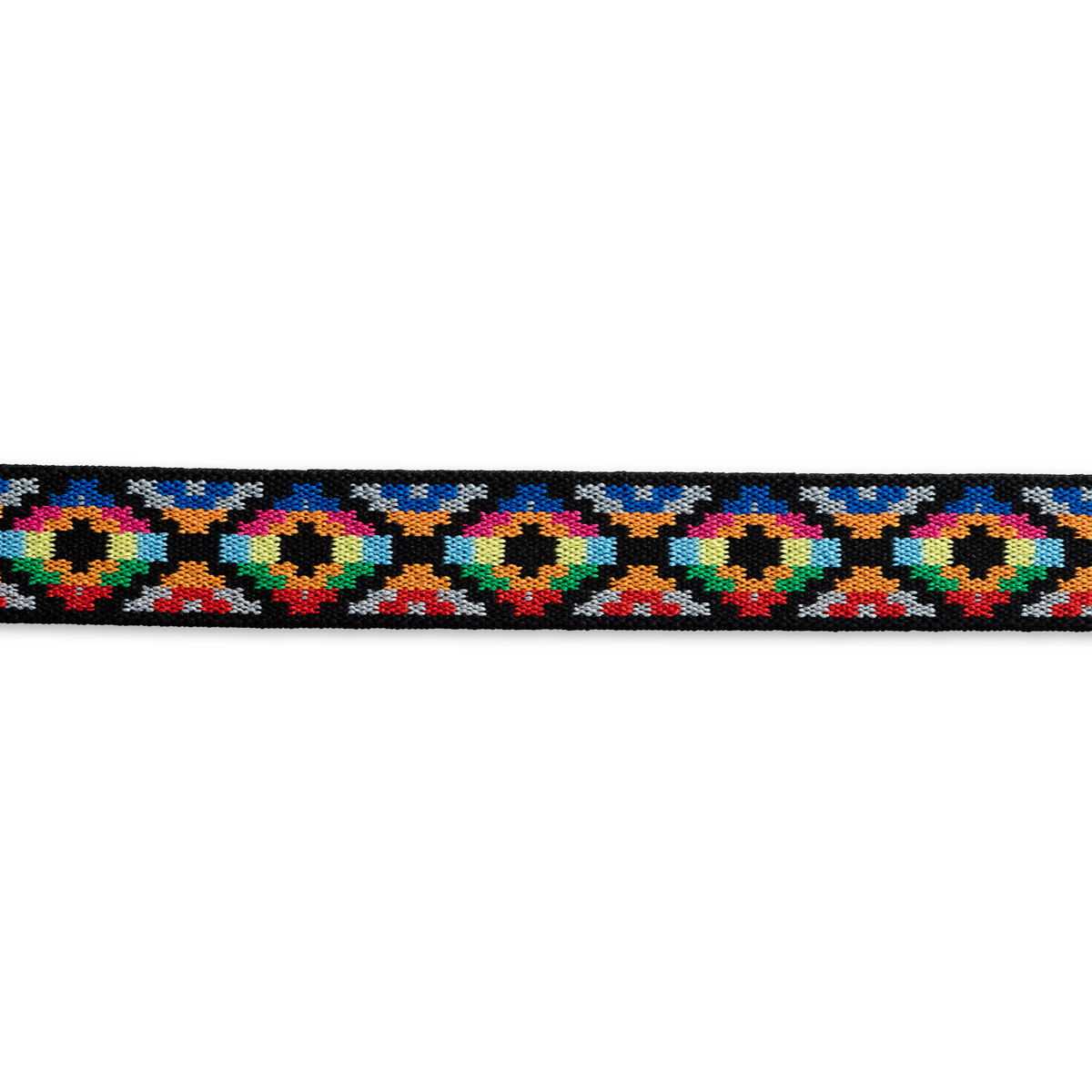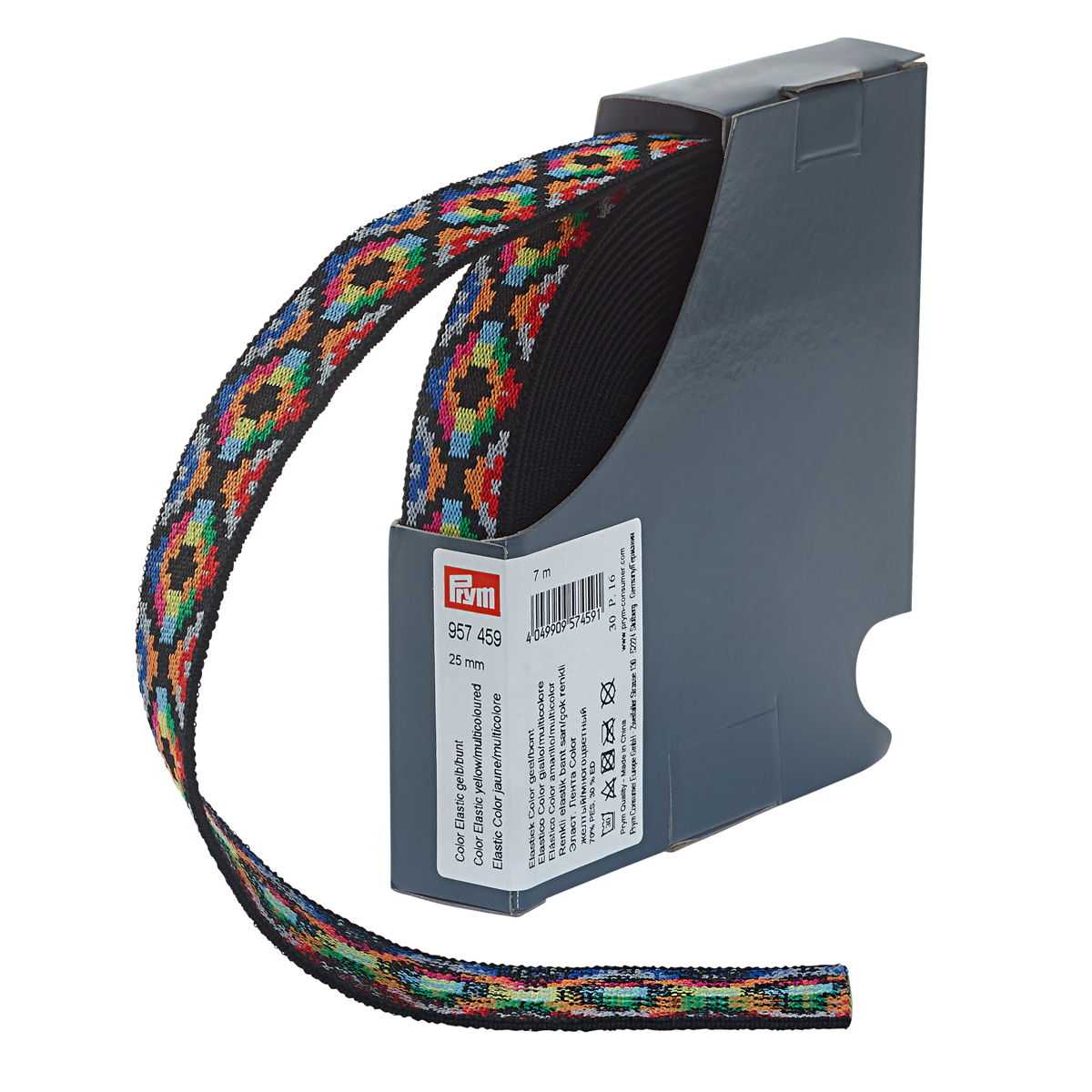 Cinta elástica de fantasía "Prym". Ideal para cinturillas de goma vista ya sea en pantalones o faldas, también queda perfecta para adornos en tejidos elásticos, para puños en pantalones...etc. Tiene un tacto suave pero fuerte, se puede lavar hasta 30ºC. Es de 25mm de ancho y en este caso tiene un estampado étnico en tonos amarillo y multicolor.