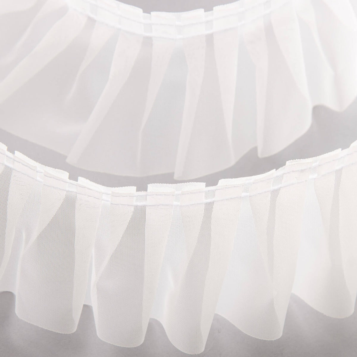 Con un ancho aproximado de 6 cm y confeccionada en 100% poliéster, esta cinta destaca por su fruncido en tablas en la parte superior, creando un efecto estructurado y elegante.