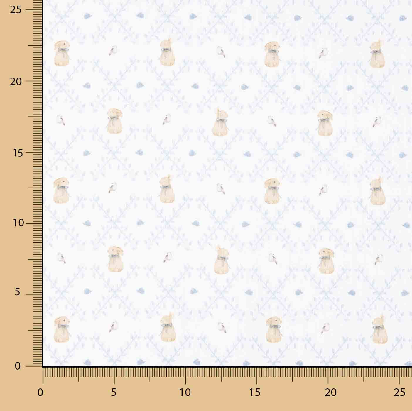 100% cotton piqué fabric 160 cm wide with a delicate print of bunnies and small motifs in powder blue on a white background, creating a sweet, classic design that is perfect for children's clothing.