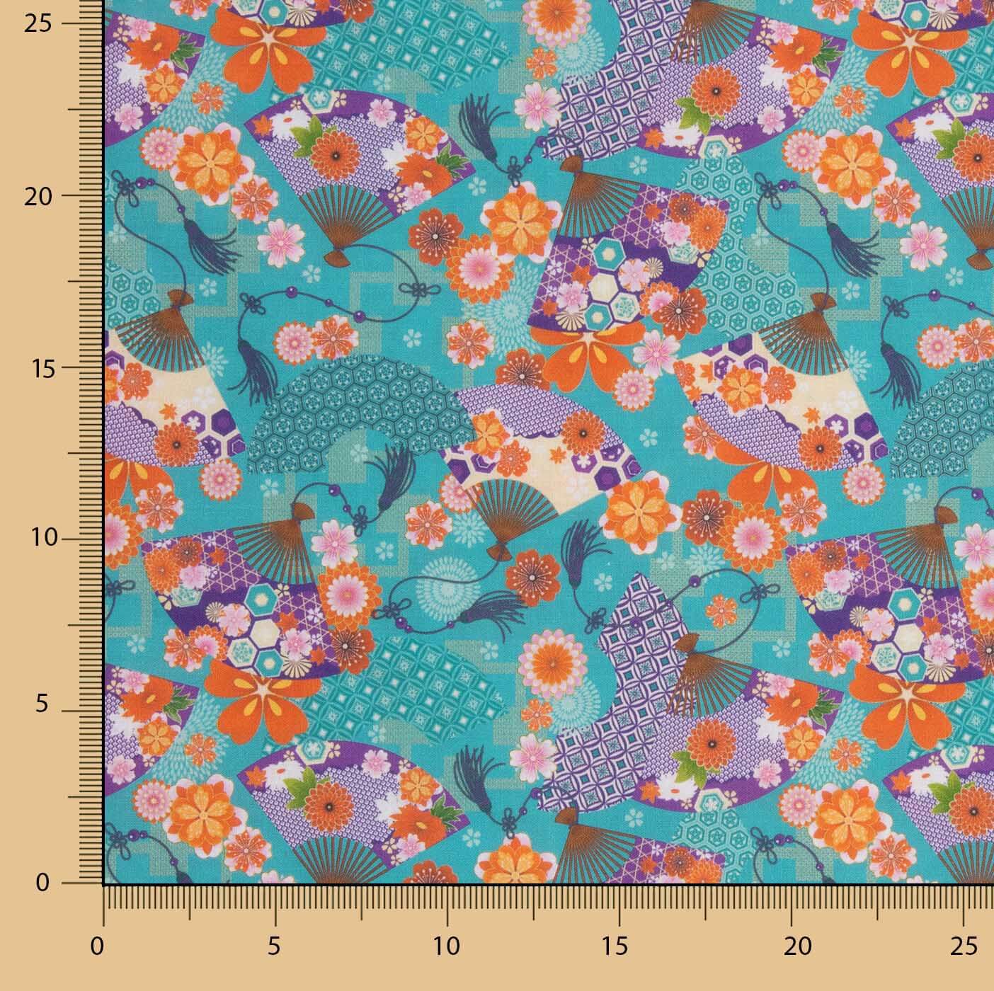 This 100% cotton poplin, with a width of 150 cm, features a colourful and dynamic Japanese print with decorated fans, flowers and cranes on a vibrant turquoise background. A cheerful, sophisticated and easy-to-sew fabric, ideal for shirts, dresses, bags, patchwork or oriental-themed decor.