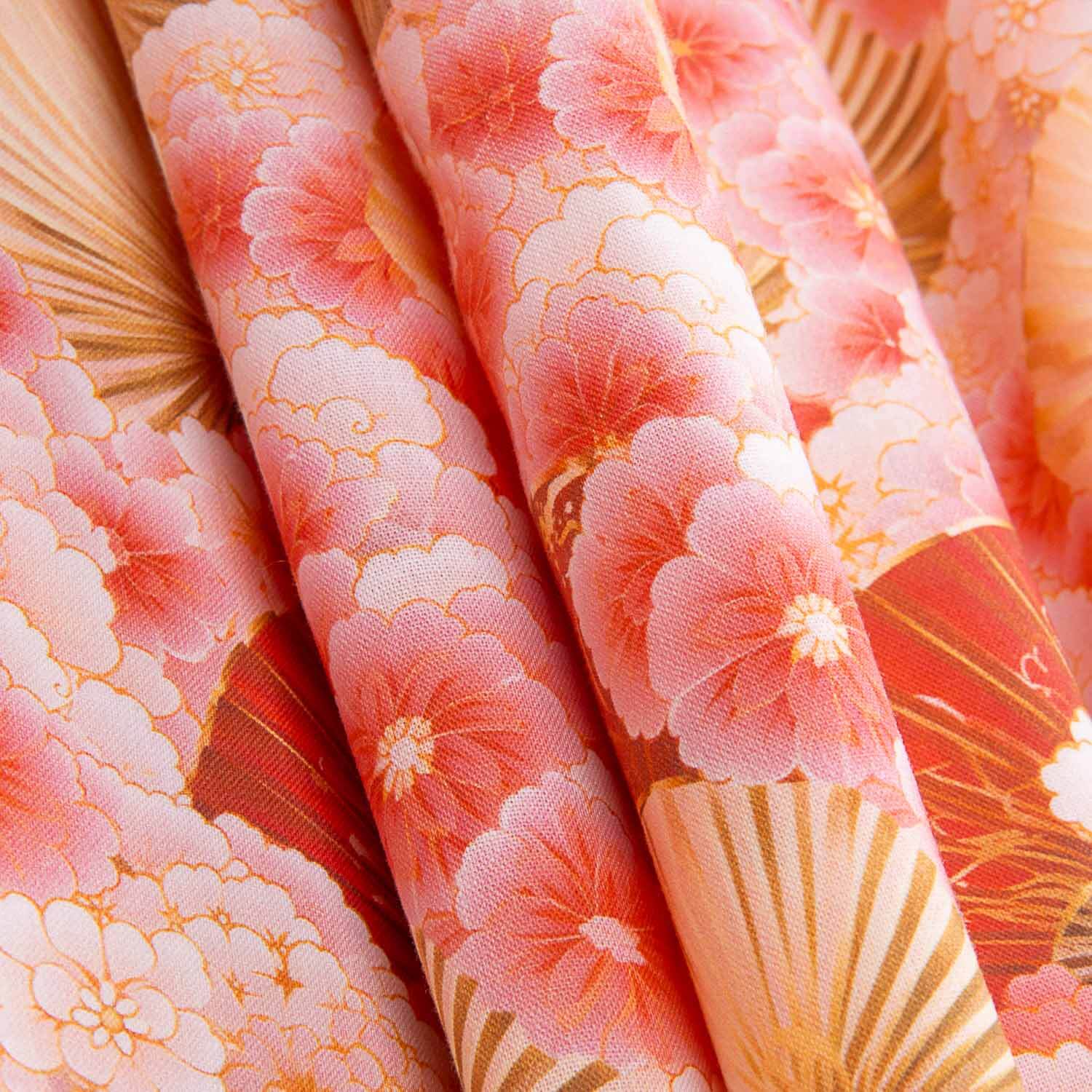 This 100% cotton poplin, with a width of 150 cm, features a Japanese fan print in ivory and red, surrounded by cherry blossoms in pink and golden details. A romantic, elegant, oriental-inspired fabric, perfect for dresses, blouses, patchwork, decor or delicate accessories. It is soft, durable and easy to sew.