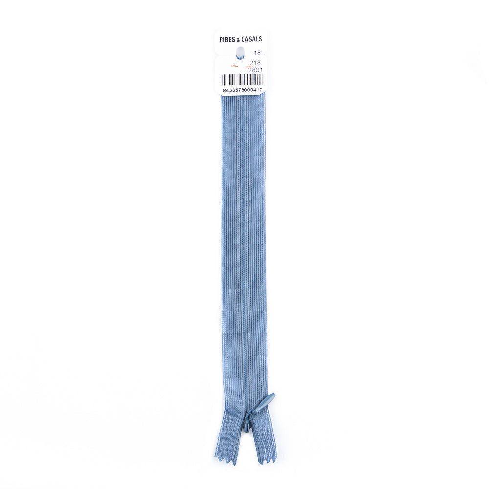Cremallera azul invisible disponible en tamaños de 18, 35 y 60 centímetros.