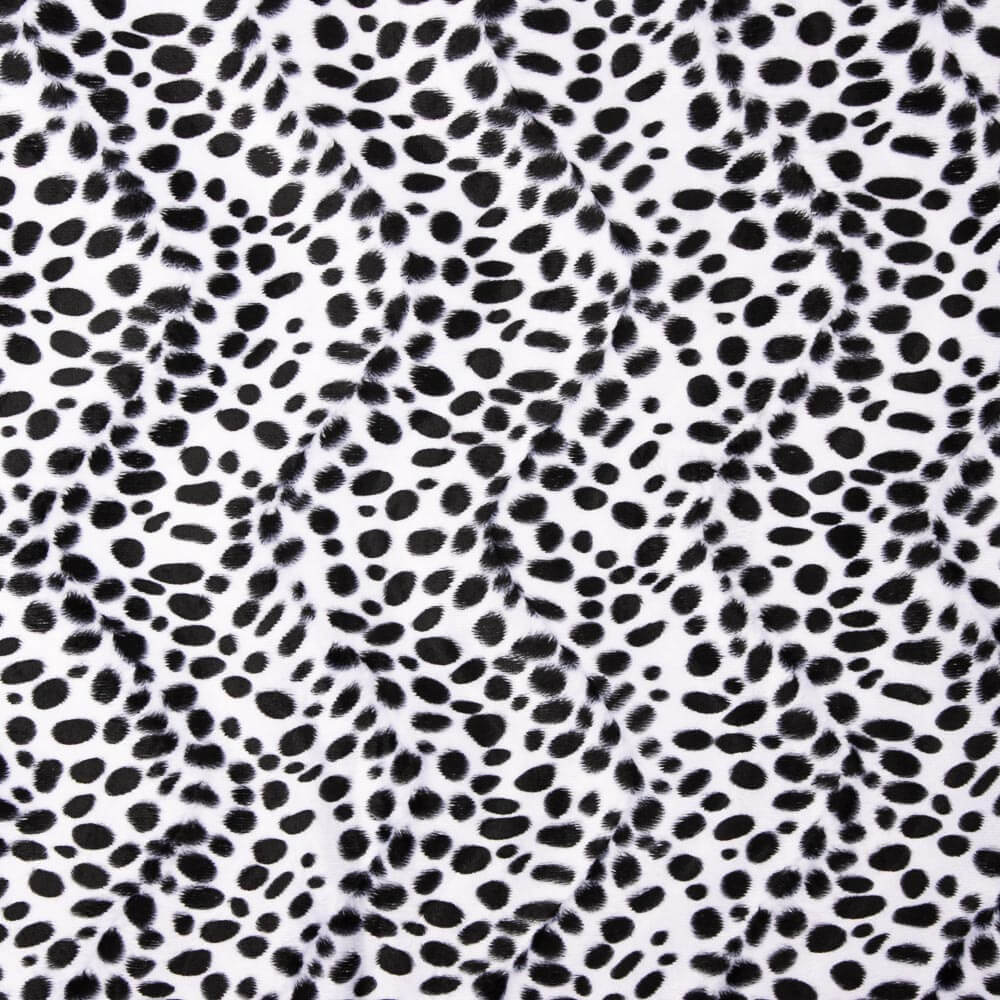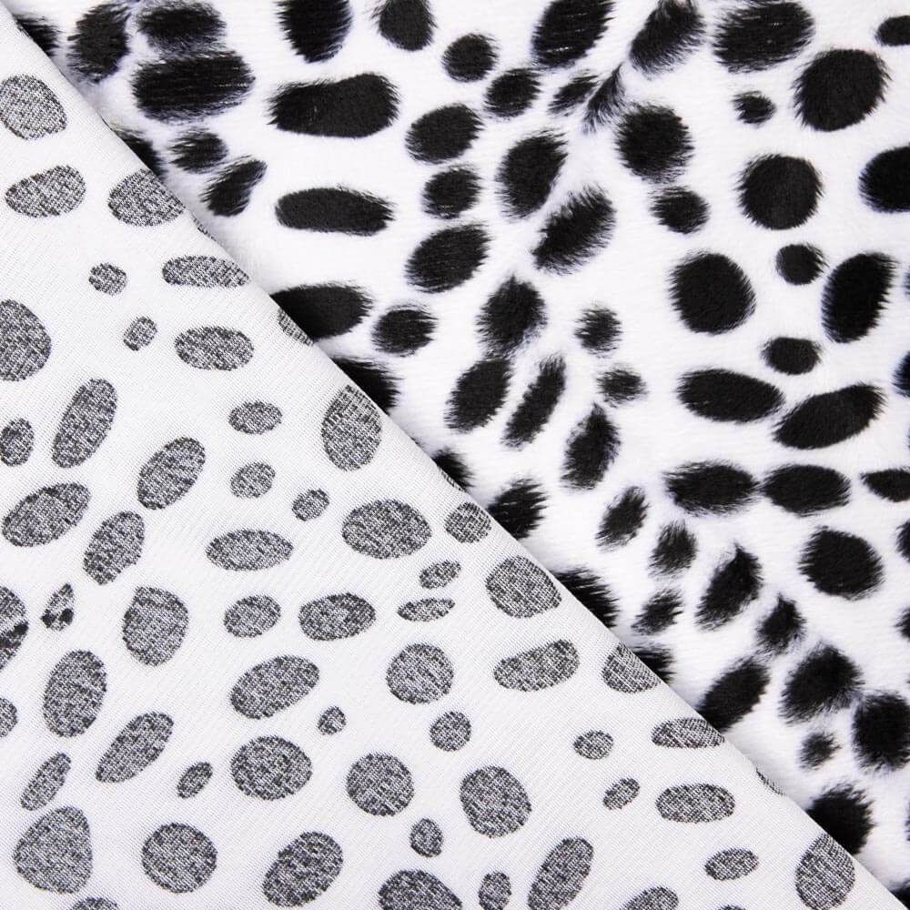 Fur fabric for dalmatian costume. Synthetic fabric very short and soft, completely opaque, it does not need lining. Perfect fabric for making animal costumes, decoration and even furnishings.