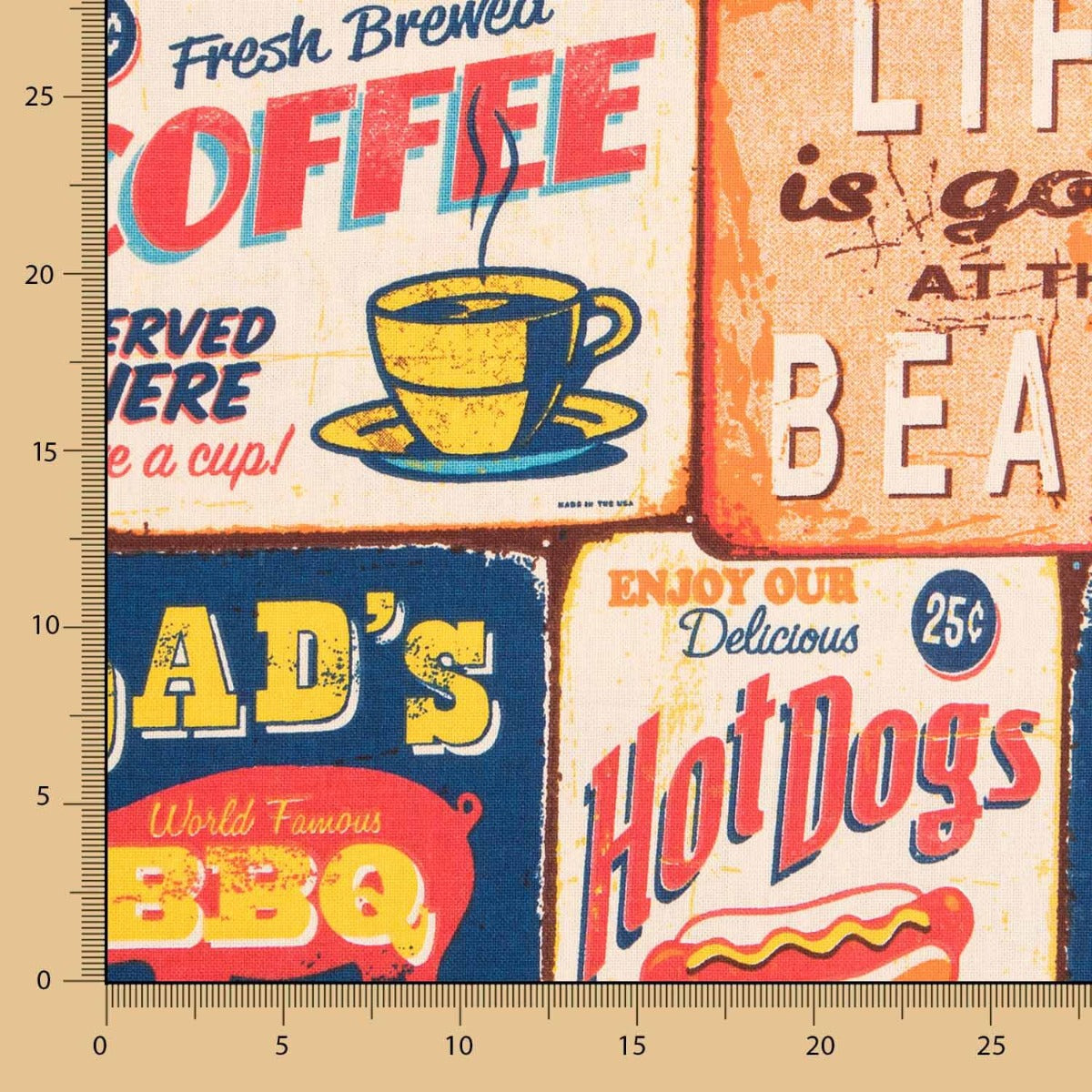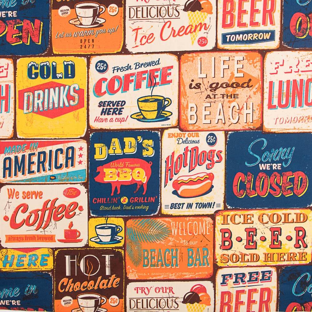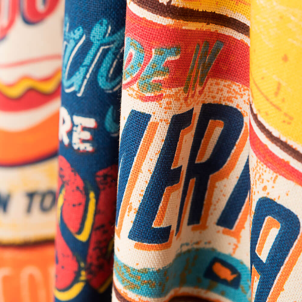 Canvas printed with vintage style drink labels, very decorative. Fabric for home decoration, cushions, blankets and all kinds of accessories. Such as bags or totbags. It is a totally opaque, soft and drapey fabric, with great resistance to rubbing.