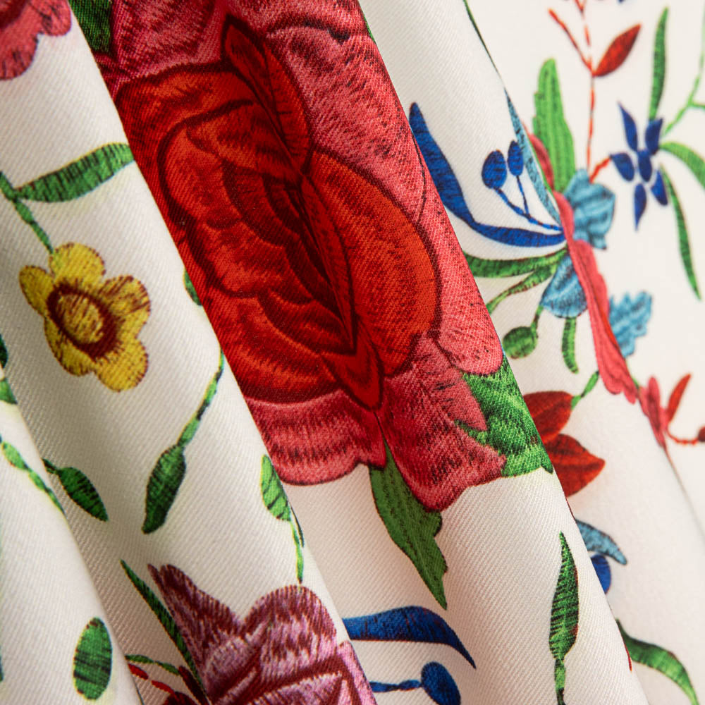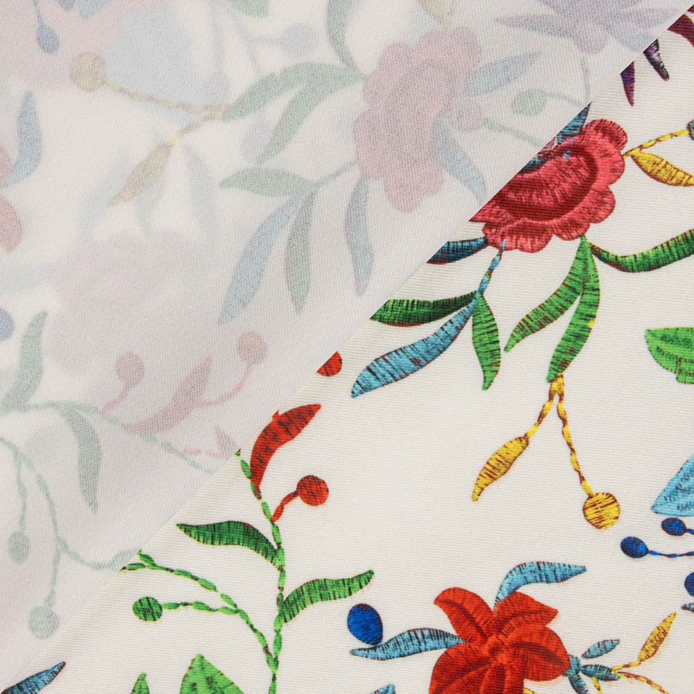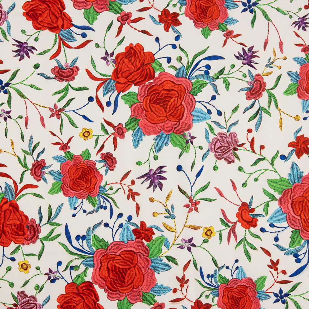 Flat stretch polyester fabric with Ecru manila print. Flat fabric with 3% of stretch with a very thin, slightly rough texture, perfect for sew skirts, trousers, flamenco dresses.