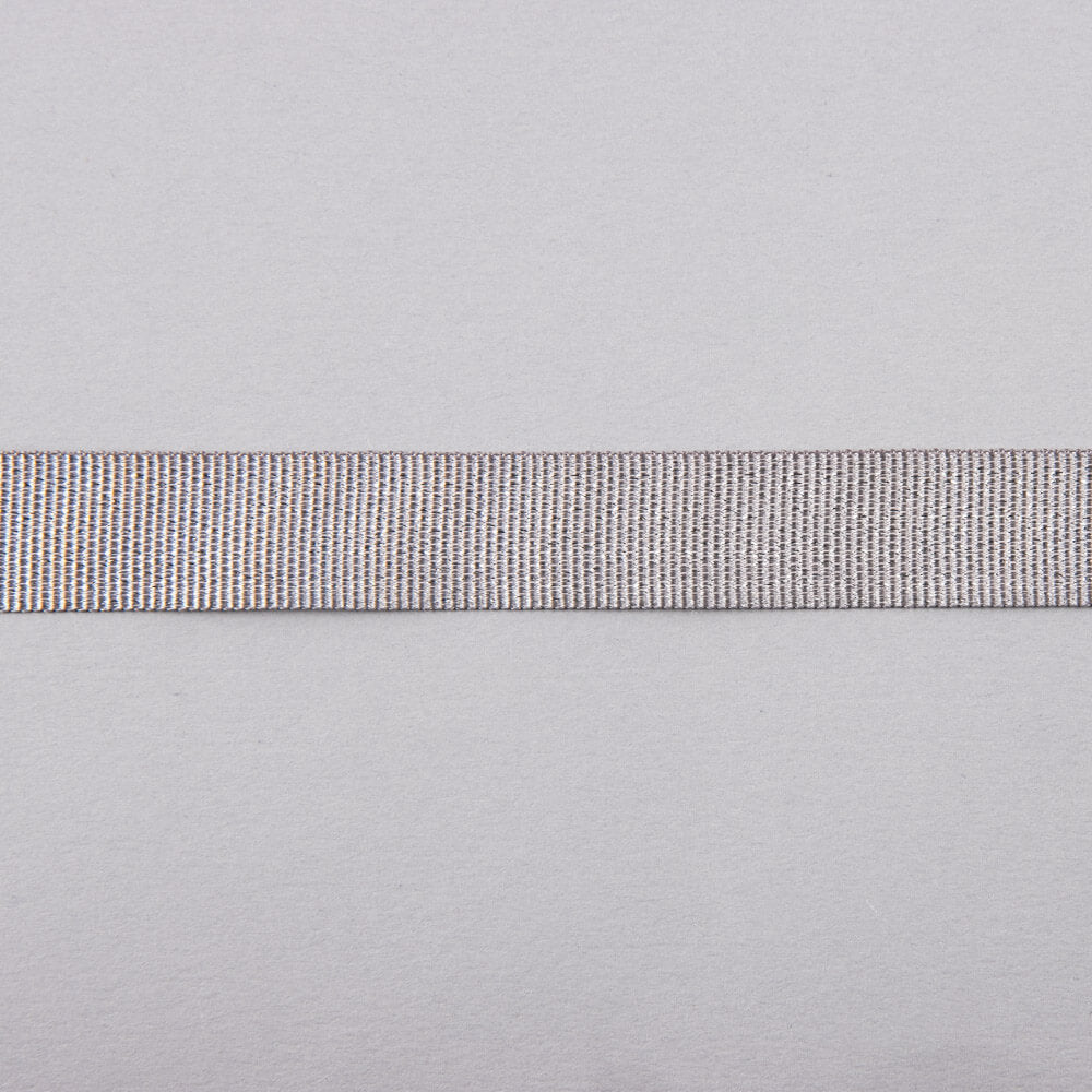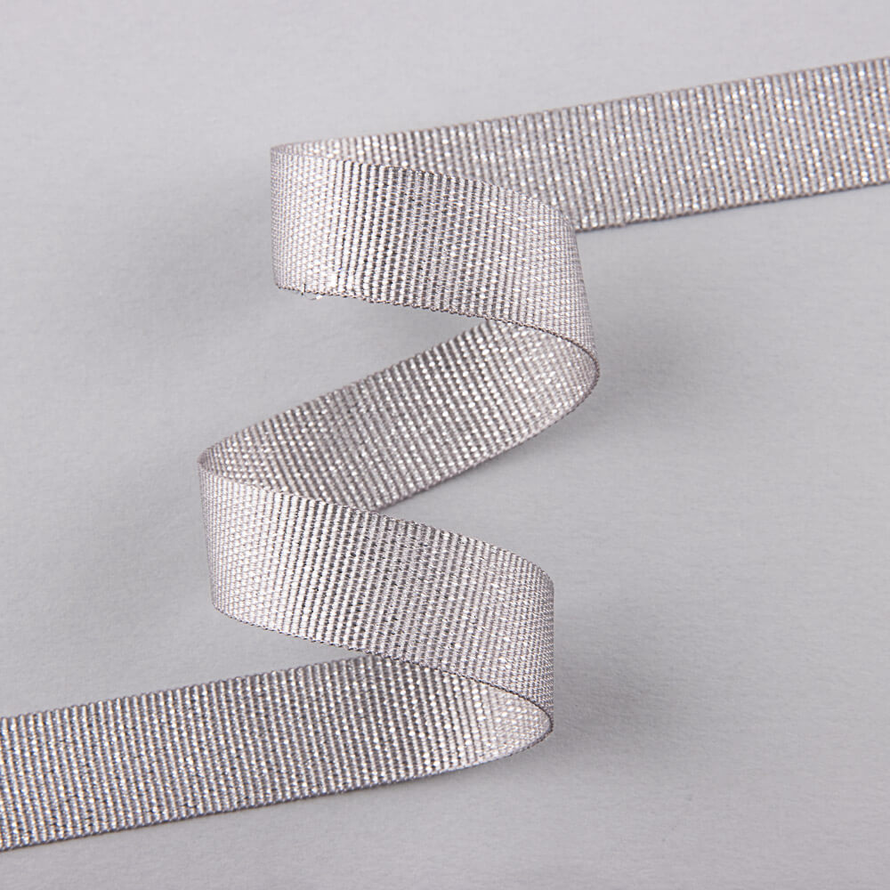 Ottoman ribbon of 15 mm width, with a fantasy glitter silver lurex on grey colour. Also known as gros-grain, this ribbon is resistant and somewhat stiff but very malleable, with a glitter striped pattern. You can sew decorative element, personalize or give reinforcement to your creations. You can buy as many metres as you need, price per metre.