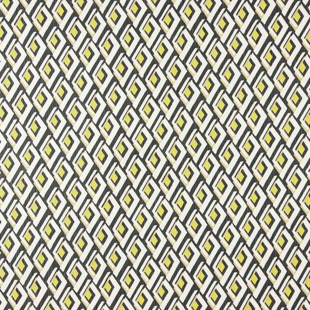 Explora la elegancia ligera con esta tela de gasa en poliéster, diseñada con un llamativo estampado geométrico que combina tonos como amarillo, negro, verde y beige sobre un fondo blanco.
